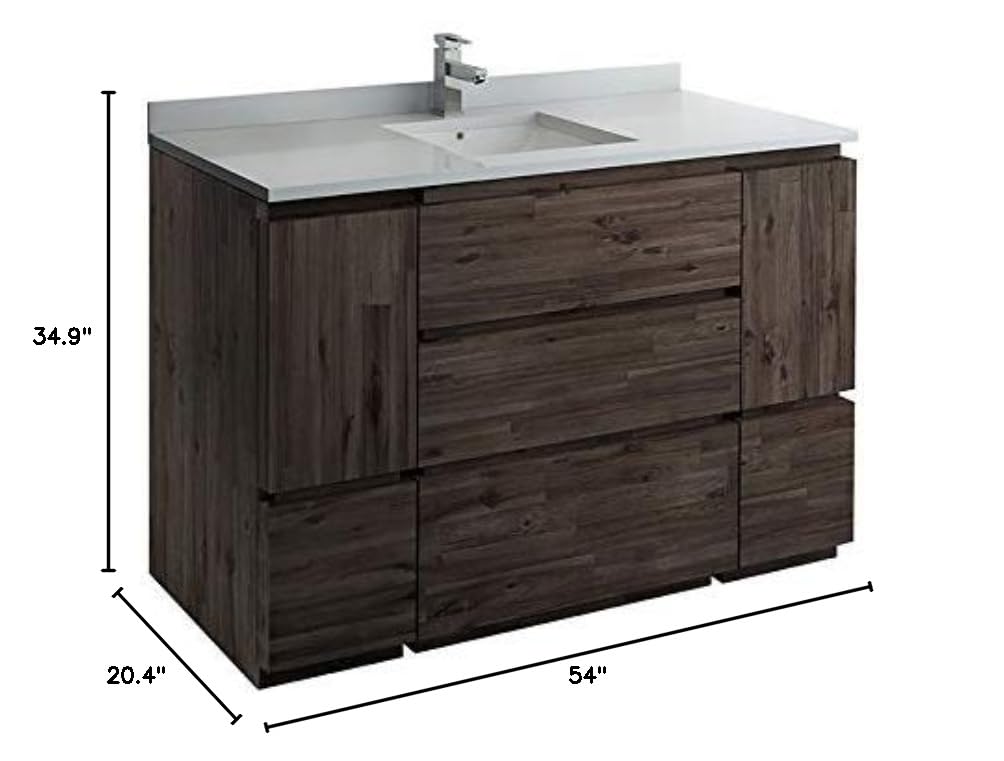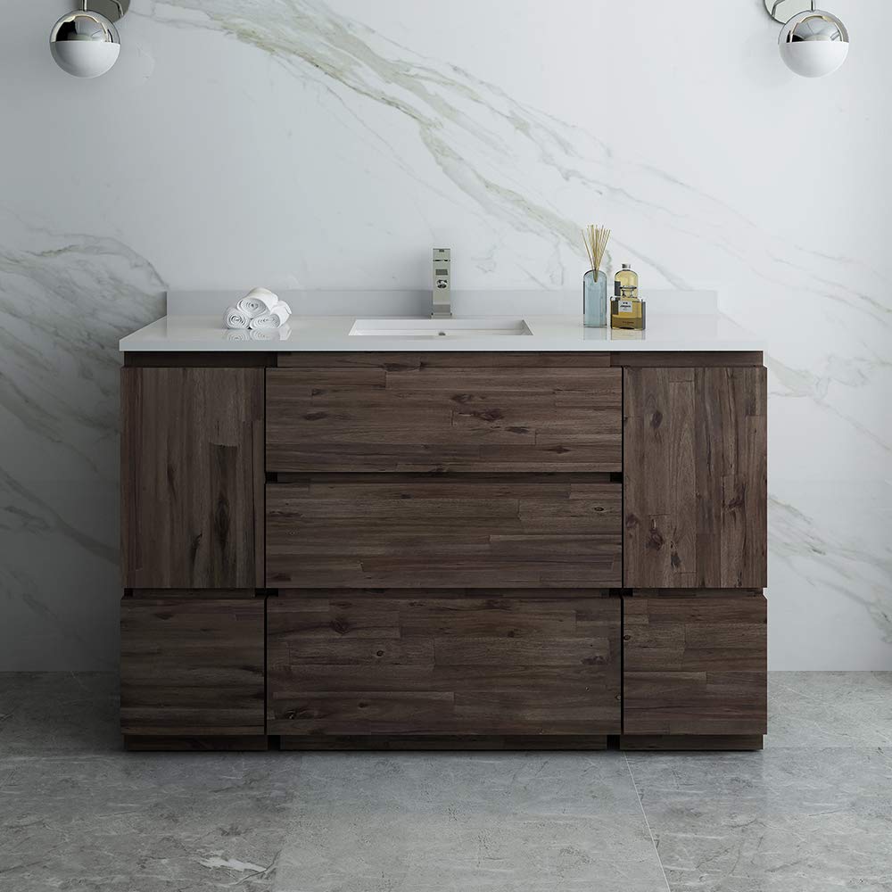 The Fresca Formosa 54"Floor Standing Modern Bathroom Cabinet with Top and Sink is superbly crafted of solid Acacia wood, known for its magnificent beauty and durability. It has a warm gray finish with a hint of brown throughout, and a natural grain that will inject luxurious warmth into any space. A masterpiece of elegance and style, free-standing cabinet has a bold shape and measures 54" in width. It adds grand style to any bathroom. With three large solid wood, soft-closing dovetail drawers down the middle, and two roomy cabinets with lower drawers beneath them, this bathroom cabinet features tons of storage, ideal for keeping a family organized. The solid pine drawers are clear coated and feature a mitered, wrap-around design that adds to the superior detailing. Cove routed pulls are carved directly into the drawers and cabinet doors, keeping the design sharp and sophisticated. Gracing the top of the cabinet is a stunning quartz stone countertop and ceramic undermount basin. The white ceramic basin is equipped with an overflow and the countertop has been pre-drilled to accommodate a single hole faucet (sold separately). The Fresca Formosa Floor Standing Modern Bathroom Cabinet with Top and Sink is available in multiple sizes and styles. It includes installation hardware.