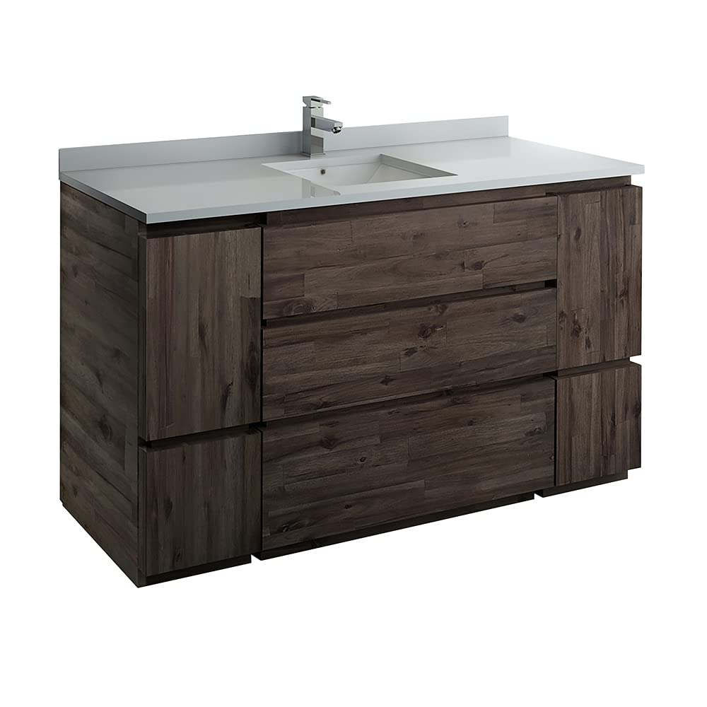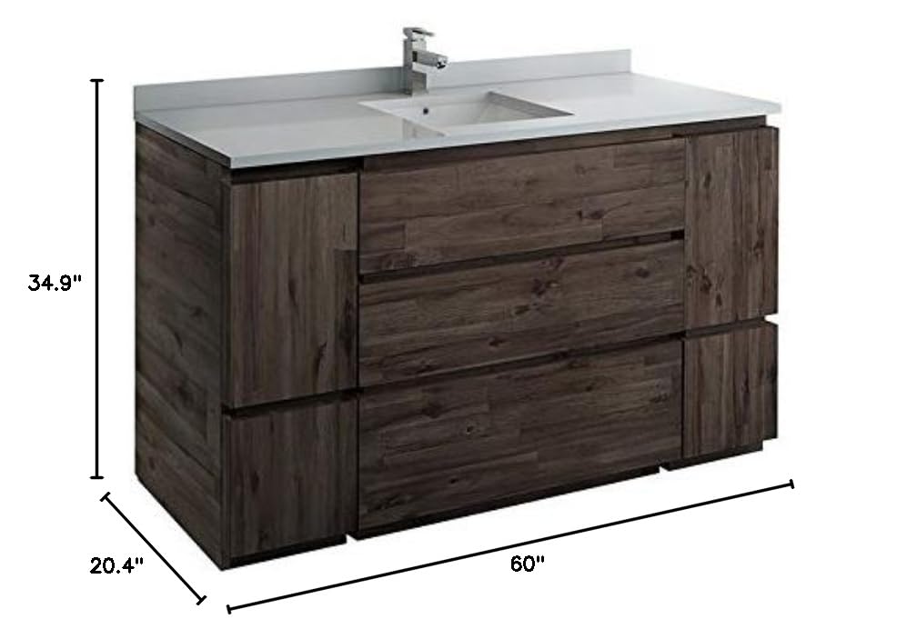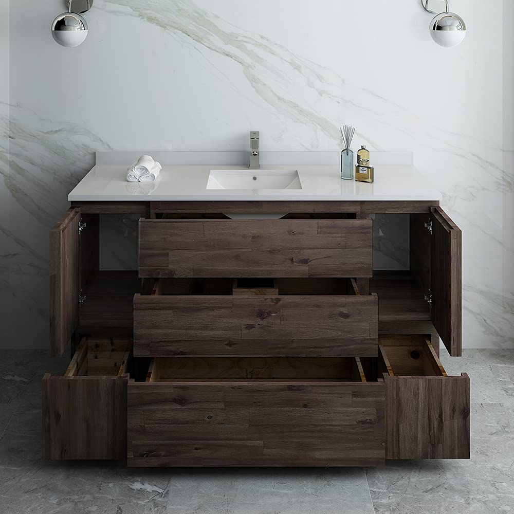The Fresca Formosa 60"Floor Standing Modern Bathroom Cabinet with Top and Sink is superbly crafted of solid Acacia wood, known for its magnificent beauty and durability. It has a warm gray finish with a hint of brown throughout, and a natural grain that will inject luxurious warmth into any space. A masterpiece of elegance and style, free-standing cabinet has a bold shape and measures 60" in width. It adds grand style to any bathroom. With three large solid wood, soft-closing dovetail drawers down the middle, and two roomy cabinets with lower drawers beneath them, this bathroom cabinet features tons of storage, ideal for keeping a family organized. The solid pine drawers are clear coated and feature a mitered, wrap-around design that adds to the superior detailing. Cove routed pulls are carved directly into the drawers and cabinet doors, keeping the design sharp and sophisticated. Gracing the top of the cabinet is a stunning quartz stone countertop and ceramic undermount basin. The white ceramic basin is equipped with an overflow and the countertop has been pre-drilled to accommodate a single hole faucet (sold separately). The Fresca Formosa Floor Standing Modern Bathroom Cabinet with Top and Sink is available in multiple sizes and styles. It includes installation hardware.