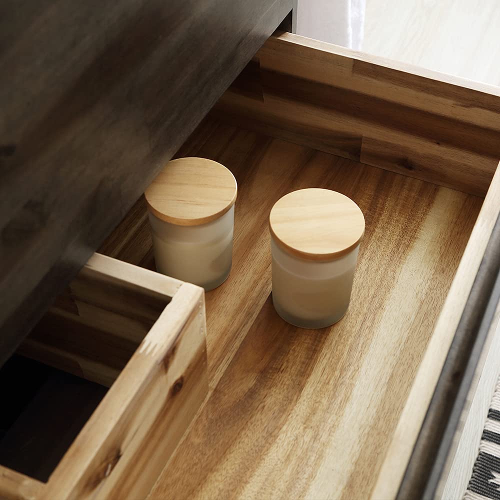 - Materials: Solid acacia wood construction, quartz stone countertop, ceramic undermount sink with overflow