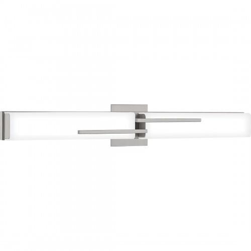Upgrade your bathroom with the modern style of the Allison collection. The rectangular silhouette features a Brushed Nickel finish paired with an etched white painted glass shade for a polished look. Integrated LED technology adds sensibility to the already sleek design.