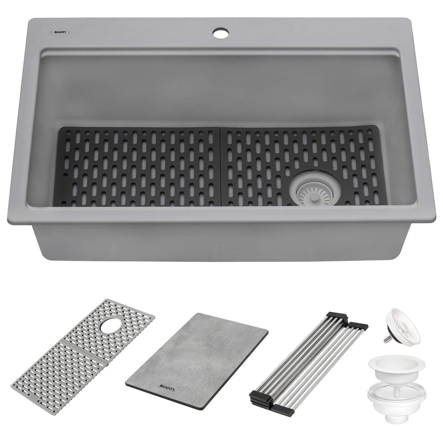 - INCLUDED IN BOX: sink, solid composite cutting board, stainless steel foldable drying rack, silicone bottom rinse grid, matching color basket strainer drain assembly, installation guide.