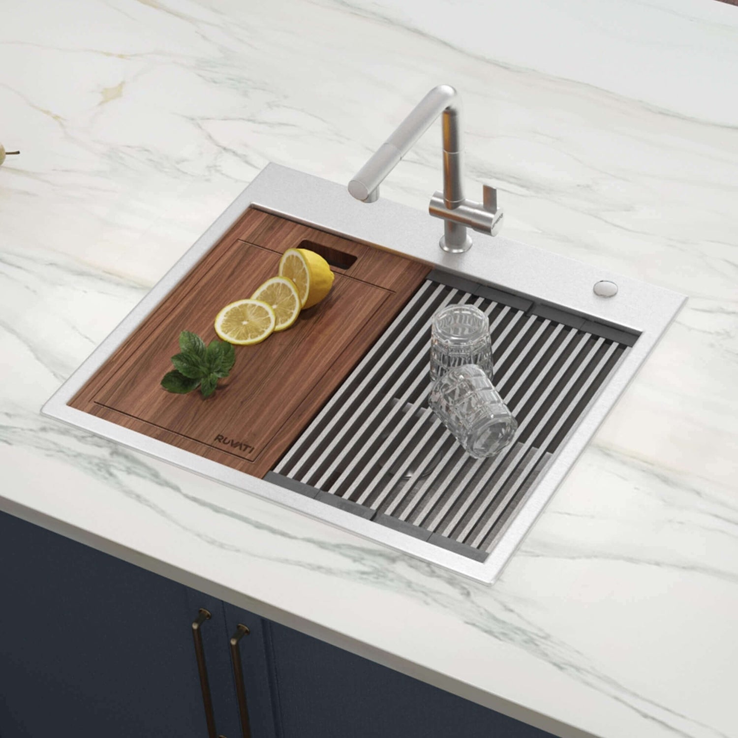 Sleek and stylish - the Siena collection from Ruvati combines a solid topmount rim with a functional workstation. Featuring sinks of all sizes, each is accompanied by a variety of accessories. From Ruvati's patented foldable drying rack® to the classic cutting board and colander combination, everything you need is right where you need it. With a 1-inch wide and 1/4-inch high rim that sits on the countertop, you can do all your prep work right on top of your sink and keep your kitchen or bar free of mess. With the Siena collection, you can do so much more with your space.