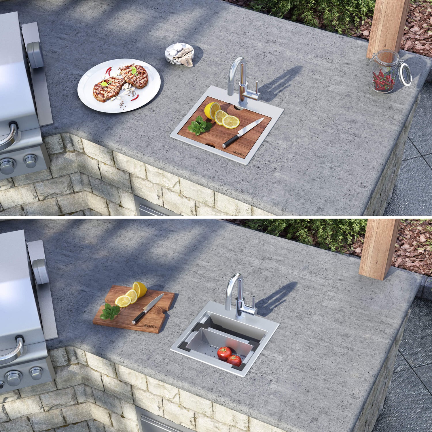 • INCLUDED IN BOX: Sink, cutting board, colander, cut-out template, rinse grid, basket strainer, and mounting brackets.