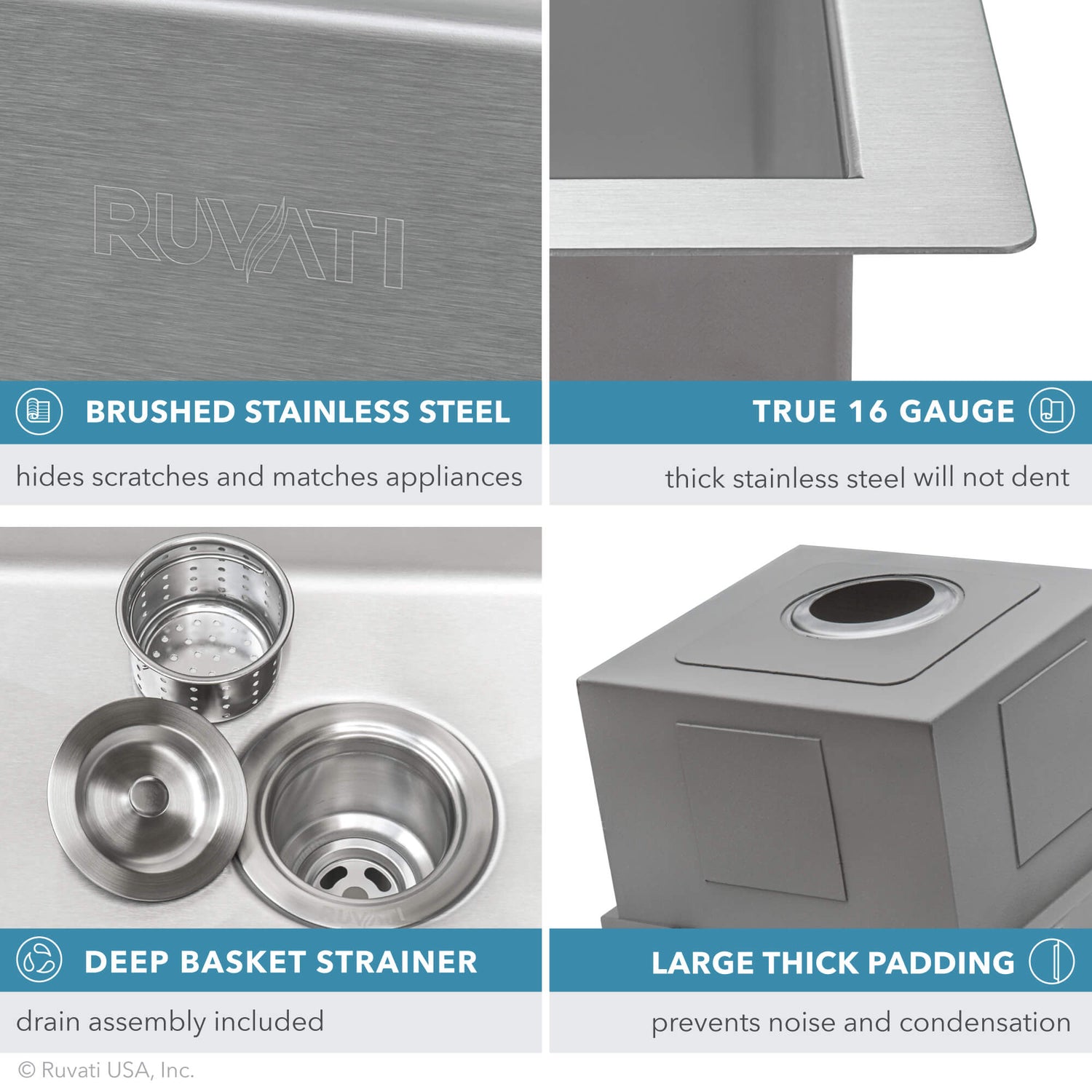Ruvati 15 x 15 inch Workstation Drop-in Topmount Bar Prep RV Sink 16 Gauge Stainless Steel - RVH8215
