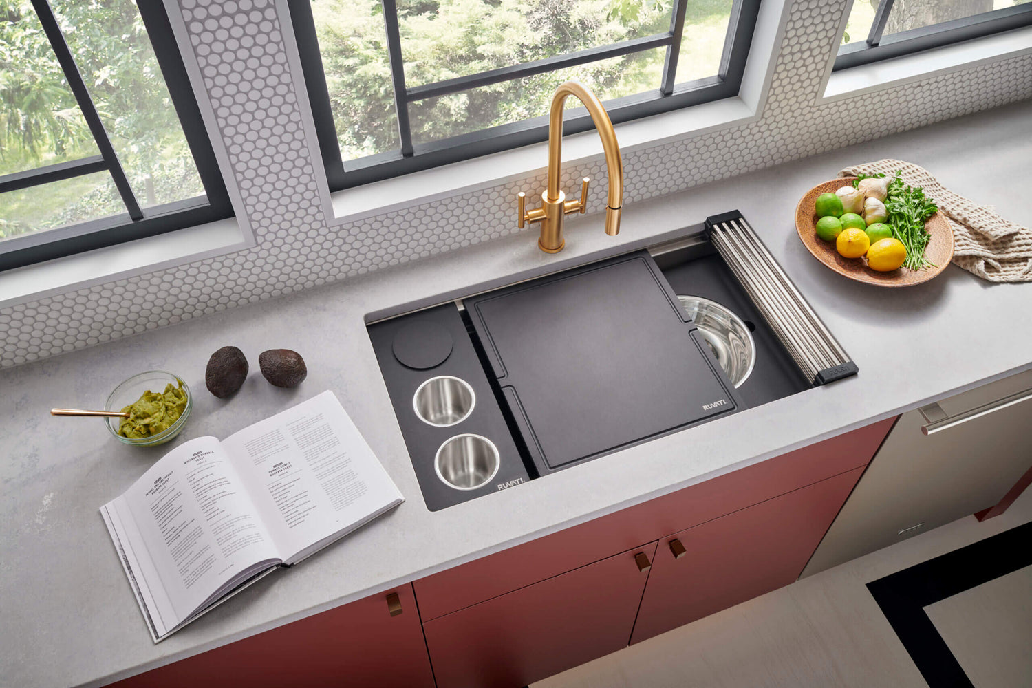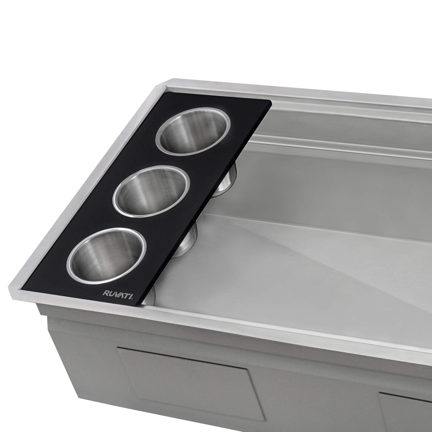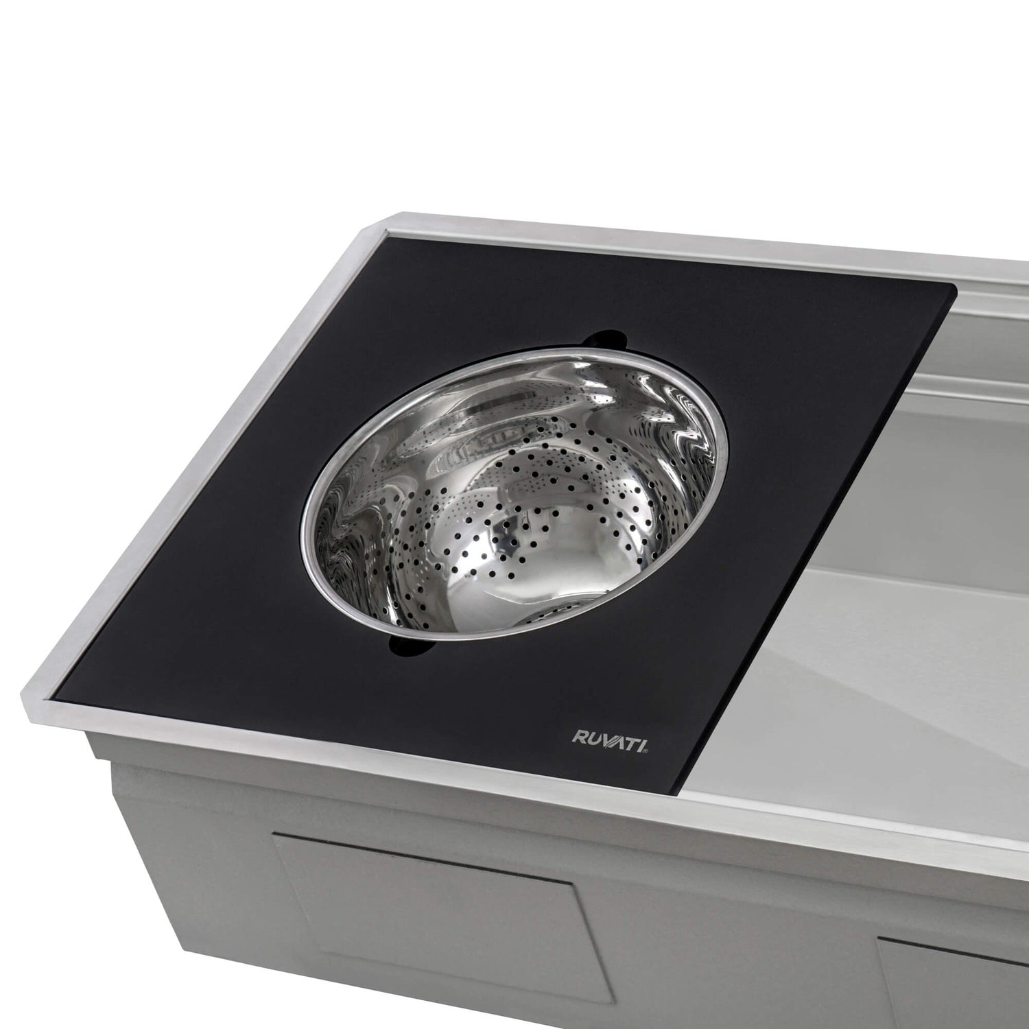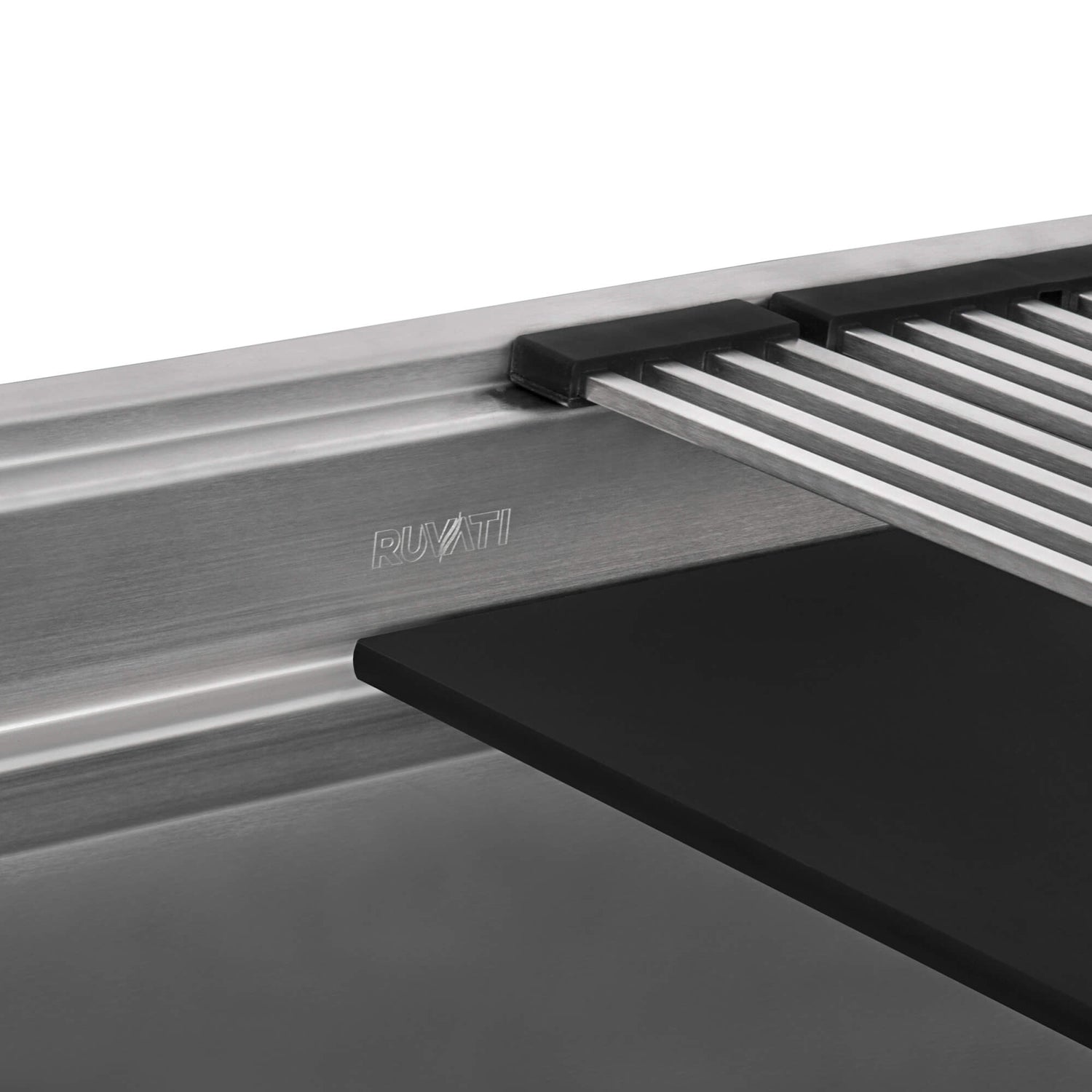 Ruvati has revolutionized their workstation sink series with the Dual-Tier Nova collection featuring black solid composite accessories. The patented dual-tier ledge features two tiers of tracks on top of one another that allow for more accessories, further function, and more opportunity. This collection also features an offset drain paired with Ruvati's innovative 1-inch slope bottom®. Unique to this collection, along with Ruvati's patented foldable drying rack, each Dual-Tier Nova sink includes a black solid composite cutting board and a 3-bowl mixing tray and mixing bowl/colander set with a solid black composite platform. With its substantial size and an abundance of built-in black accessories, the Ruvati Dual-Tier Nova collection truly redefines the kitchen space and experience.