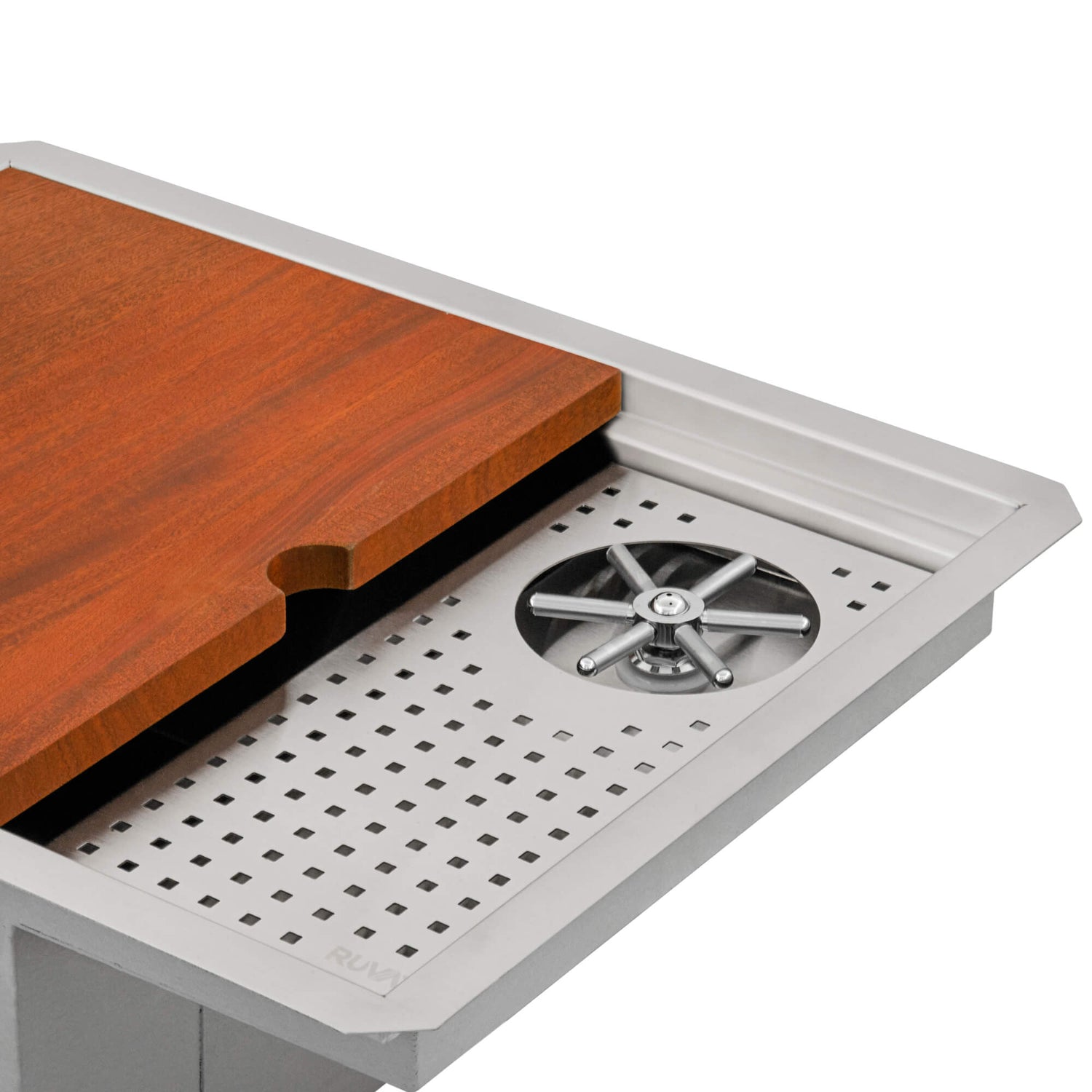 • INCLUDED IN BOX: Glass rinse sink, Basket Strainer, Flex Hose, Sprayer Assembly, Rinse Grid, Cutting Board (set of 2), Drainer Grate, Drain Cover, Cut-out Template, Mounting brackets, Installation guide.