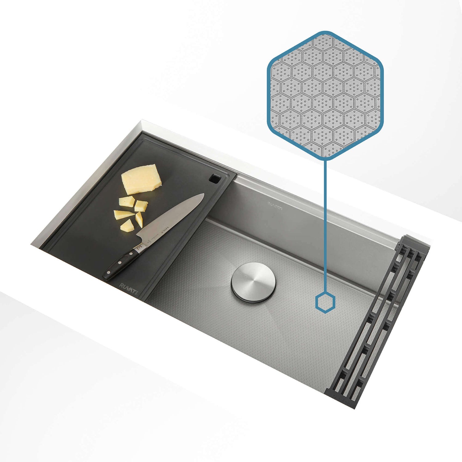 For a workstation sink with immense durability, look no further than the Roma Hex collection by Ruvati. Hexbottom sinks from Ruvati feature an embossed stainless steel with a hexagonal pattern and matte finish for a semi reflective look. This textured bottom minimizes contact points and protects the sink from scratches and everyday wear and tear. The workstation design features undermount sinks with a built-in ledge that provides a platform for Ruvati's unique accessories. Each sink in the Roma Hex collection features a black composite cutting board and Ruvati's patented black foldable drying rack. With the Roma Hex collection, you can do all your prep work on top of your sink and keep your countertops free of mess.