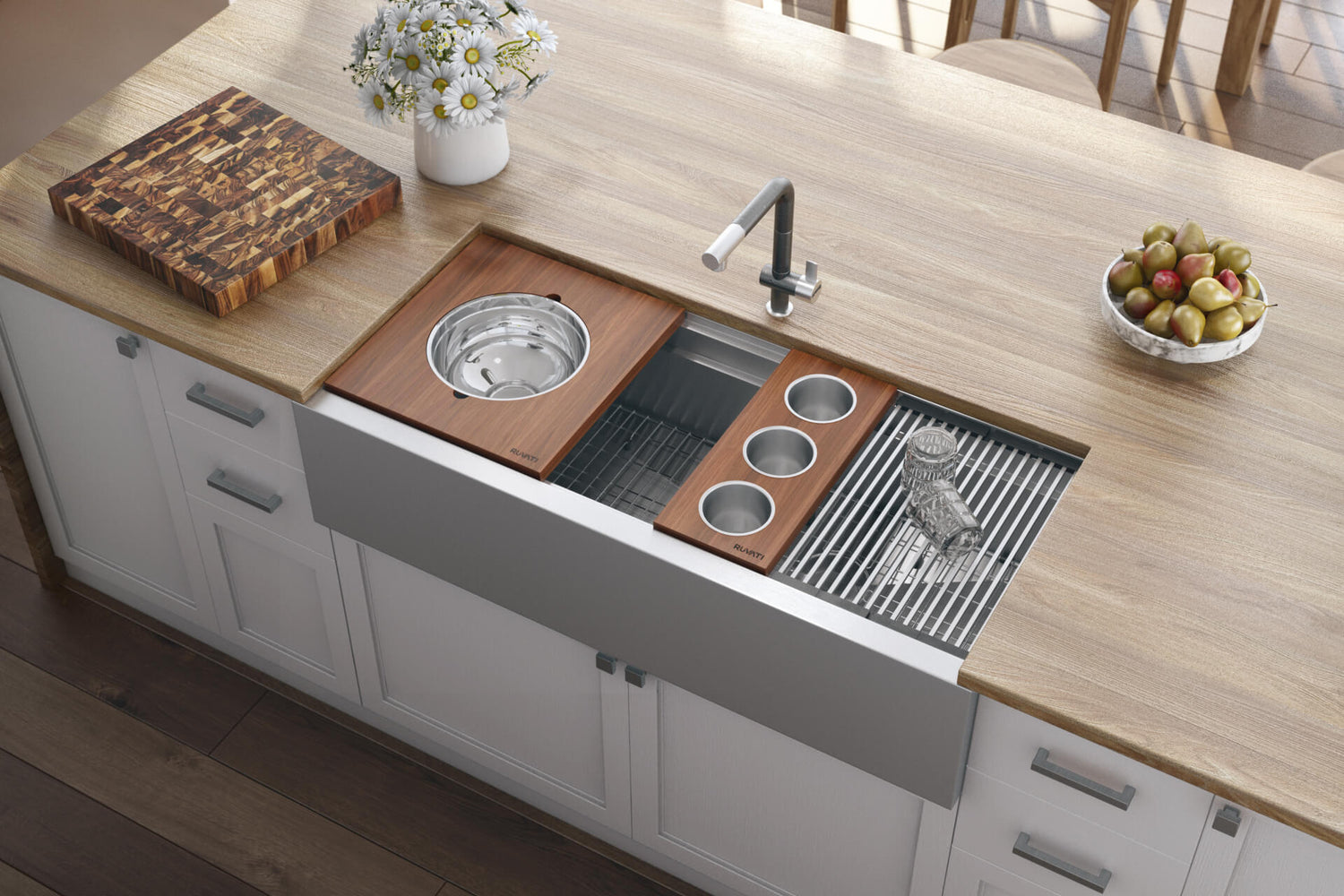 Ruvati takes functionality to a whole new level with the Dual-Tier collection that converts your kitchen sink into a full-fledged workspace. The patented dual-tier ledge features two tiers of tracks on top of one another that allow for more accessories, further function, and endless possibilities for your kitchen design. This collection also features an offset drain paired with Ruvati's innovative 1-inch slope bottom®. Unique to this collection, along with the classic cutting board and patented foldable drying rack combination, each Dual-Tier sink includes a 3-bowl mixing tray and mixing bowl/colander set with a hardwood platform. With its substantial size and an abundance of built-in accessories, the Dual-Tier collection from Ruvati truly redefines the kitchen space and experience.