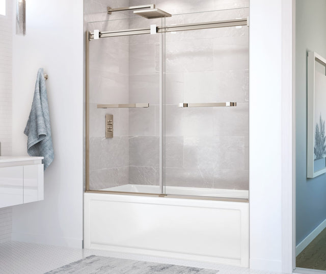 MAAX 136270-900-290-000 Duel 56-59 x 55 ½ x 59 in. 8 mm Bypass Tub Door for Alcove Installation with Clear glass in Brushed Nickel & Matte White