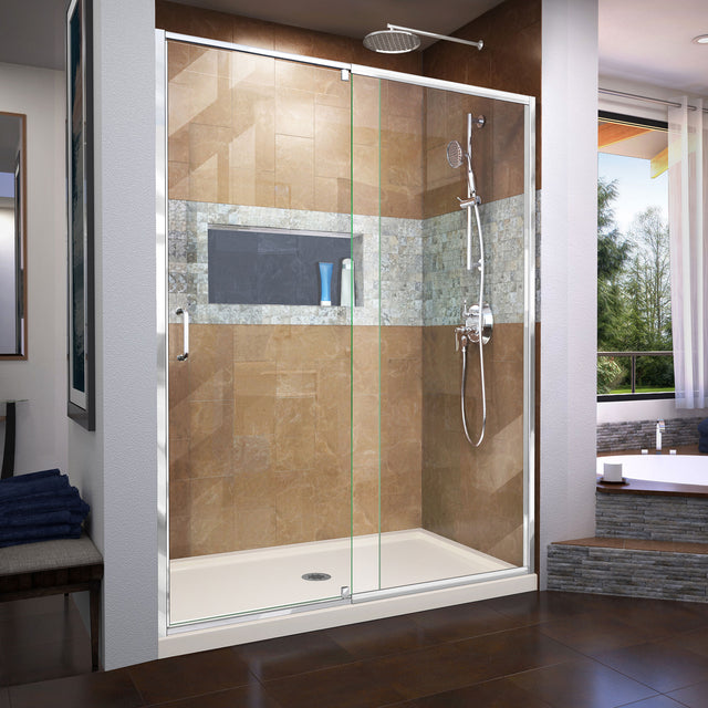 DreamLine Flex 32 in. D x 60 in. W x 74 3/4 in. H Semi-Frameless Pivot Shower Door in Chrome with Center Drain Biscuit Base Kit