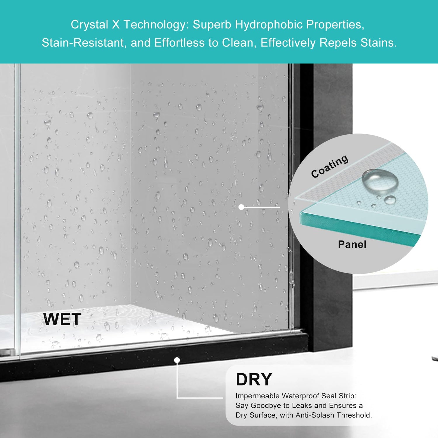 - In addition to its seamless closing mechanism, the two shower door glass panels feature our innovative Crystal X tech water and stain-resistant glass coating. This cutting-edge coating effectively prevents watermarks, making the cleaning process a breeze and keeping your shower door looking spotless and beautiful.