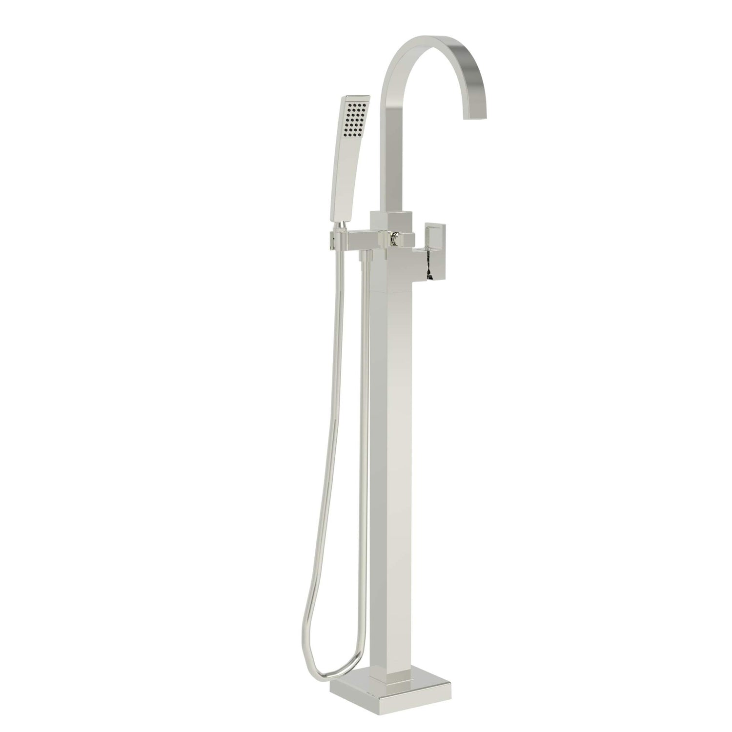 Product Features: Brass construction of faucet body and handles ensures reliability Covered under Newport Brass' 10-year limited for residential installations and 1-year limited for commercial installations Premier finishing process - finishes will resist corrosion and tarnishing through everyday use Includes hand shower - handy for rinsing down the tub or just rinsing off after a bath Floor mounted tub filler Smooth single handle operation Single handle included with the faucet Rough-in valve not required butNewport Brass 1-339 may be used to ease installation ADA compliant Product Specifications: Overall Height: 43" (measured from mounting deck to highest part of faucet) Spout Height: 38" (measured from mounting deck to spout outlet) Spout Reach: 8-11/16" (measured from center of faucet base to spout outlet) Tub Spout Flow Rate: 9.25 GPM (gallons-per-minute) Hand Shower Flow Rate: 1.8 GPM (gallons-per-minute) Single faucet hole required for installation All hardware required for faucet installation is included