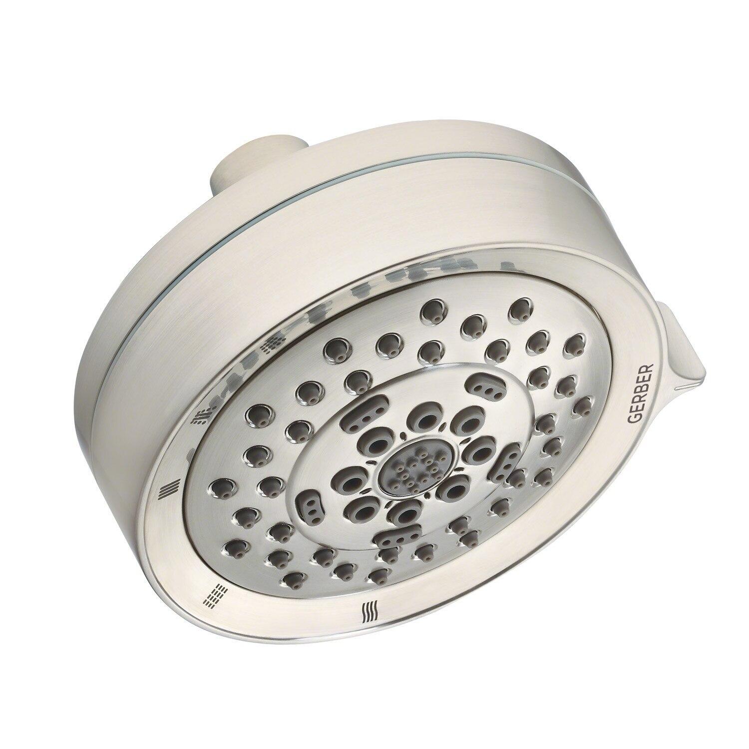 Product DescriptionGerber Plumbing has been manufacturing premium plumbing accessories from shower heads to faucets to china fixtures since 2001. Not only providing necessities, the products include a variety of decorative faucets and bath accessories. Designed with comfort, durability and style in mind, there is no question that this should be your choice when it comes to modern plumbing.From the ManufacturerFor nearly 20 years, the kitchen and bath industry has known Danze as a leader in product design and beautiful styling. What industry professionals and homeowners may not have known is that Danze has a sister company, Gerber - an 85-year-old manufacturer of some of the highest performing, most reliable products on the market. To best meet the diverse and ever-changing needs of home products, Danze has transformed to be Danze by Gerber, a perfect blend of the handcrafted, trusted performance of Gerber on the inside and beautiful design on the outside. The Danze by Gerber product combination can be found in a range of kitchen and bath faucets, bath accessories and shower systems. A thoughtful balance of form and function. Inspired, beautiful design on the outside. Handcrafted, trusted performance on the inside. A combination that results in true value and commitment. You can call it a breath of fresh air. We call it Danze by Gerber. Product Information Product Overview Flow Rate: 1.75gpm Max Flow Rate @ 80 psiMaterial/Material Construction: Brass Ball Joint with Polymer BodySpray/Stream Function: 5 Functions: Wide Aeration Centerjet Massage and Wide + CenterjetBrand: Gerber Features Dual Valve Technology: Features Dual Valve technology which minimizes water pressure loss as setting changesEasy Clean Nozzles: Features Easy Clean Soft-Touch NozzlesEasy-Glide Selector Ring: Features Easy-Glide selector ring for effortless smooth adjustmentWarranty: Limited lifetime Description With inspired design and quality craftsmanship at the forefront Gerber showerheads are the choice for a consistently exceptional experience. The Easy-Glide Selector Ring ensures effortless smooth adjustments when switching between five functions while Dual Valve Technology minimizes potential water pressure loss.