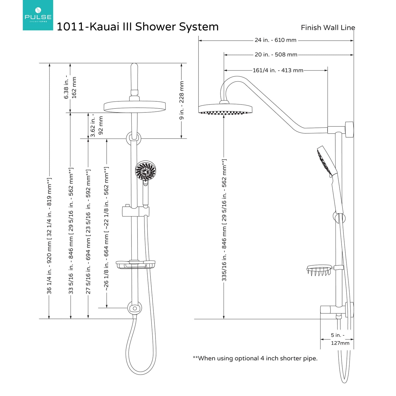 PULSE ShowerSpas 1011-CH-1.8GPM Kauai III Shower System, with 8" Rain Showerhead, 5-Function Hand Shower, Adjustable Slide Bar and Soap Dish, Polished Chrome, 1.8 GPM. The brilliantly simple Kauai III Rain Shower System easily retrofits your existing shower without a remodel! Replace your old showerhead with an elegant rain showerhead; 5-function hand shower with stainless steel hose; adjustable slide bar and wire basket soap dish. Sleek 8" rain showerhead easily pivots side to side on an elegantly arched shower arm. Our rub-clean soft tips with Spray Straight technology effortlessly clear mineral buildup for long-lasting performance. Integrated brass slide-bar allows adjustable height control of the hand shower and brass soap dish while providing a conveniently located diverter for switching functions. Surface mounted and completely pre-plumbed. Designed to install in virtually any shower without remodeling; a typical install is less than 1-hour even for the do-it-yourselfer. Simply connect to the water supply at your current showerhead location and use your existing hot/cold shower valve. The 59" double-interlocking, stainless steel hand shower hose features built-in backflow protection. Specifications: cUPC approved; brass and ABS construction; 1.8 gallon-per-minute flow rate; 1/2" NPT Brass Nipple; Polished Chrome finish. Manufacturer’s Limited Lifetime Warranty. PULSE ShowerSpas "Make Every Day Feel Like A Spa Day!"