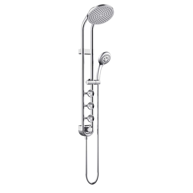 PULSE ShowerSpas 1058-CH Saturn Shower System with 8" Rain Showerhead, 3 Body Sprays, 5 Function Hand Shower, Polished Chrome. Luxuriate and relax under this beautiful and uniquely designed shower system. Pivoting 8” rain showerhead provides a calming rainfall experience. Enjoy the three PowerSpray body jets with Select-A-Jet on/off control on the top two. Choose to turn off one or both top jets and maximize water pressure to bottom jet for a soothing massage-like spray. The invigorating, 5-function hand shower offers an array of patterns to soothe your body: Jet, Wide, Wide & Jet, Massage, Wide & Massage. Hand shower holder rests conveniently on built-in brass slide bar for easy, exact height adjustment. Non-marring 59" double-interlocking, stainless steel hand shower hose features built-in backflow protection. Our rub-clean soft tips with Spray Straight technology effortlessly clear mineral buildup for long-lasting performance. Conveniently located brass diverter allows choice of one function or any combination of two for a multitude of relaxing options. System is surface mounted and completely pre-plumbed. Designed to install in virtually any shower without remodeling; a typical install is less than 1-hour even for the do-it-yourselfer. Mixing valve not included. Simply connect to the current water supply locations and use your existing hot/cold shower valve. Specifications: cUPC approved; brass and ABS construction; 2.5 gallon-per-minute flow rate; 1/2" NPT Brass Nipple; Polished Chrome finish. PULSE ShowerSpas "Make Every Day Feel Like A Spa Day!"