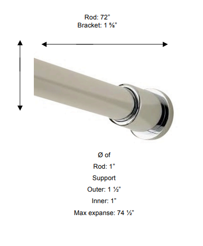 Dimensions: Rod: 72”, Ø of Rod: 1”, Support Outer: 1 ½”, Inner: 1”, Support Depth: 1 ⅝”, Max Expanse with support: 74 ½”