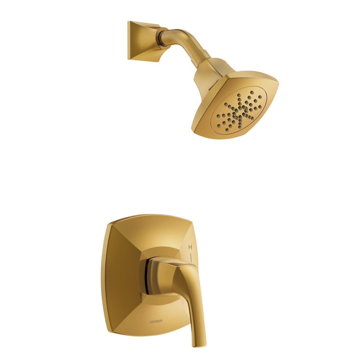 Product DescriptionCarefully curated with a streamlined aesthetic, the new Vaughn™ bath collection features a dynamic and sophisticated design. The arched curves and smooth planes of the faucet body contrast the angled faucet handle, giving the faucet an effortless beauty. Inspired by fluidity and movement, its transitional styling integrates seamlessly with any bathroom. The tub and shower trim kits are fully compatible with the powerful Gerber® Treysta valve, the latest innovation in valve technology.From the ManufacturerFor nearly 20 years, the kitchen and bath industry has known Danze as a leader in product design and beautiful styling. What industry professionals and homeowners may not have known is that Danze has a sister company, Gerber - an 85-year-old manufacturer of some of the highest performing, most reliable products on the market. To best meet the diverse and ever-changing needs of home products, Danze has transformed to be Danze by Gerber, a perfect blend of the handcrafted, trusted performance of Gerber on the inside and beautiful design on the outside. The Danze by Gerber product combination can be found in a range of kitchen and bath faucets, bath accessories and shower systems. A thoughtful balance of form and function. Inspired, beautiful design on the outside. Handcrafted, trusted performance on the inside. A combination that results in true value and commitment. You can call it a breath of fresh air. We call it Danze by Gerber. Product Information Product Overview Flow Rate: 1.75gpm Max Flow Rate @ 80 psiShower Arm Length & Material: 6 Metal Shower ArmSpray/Stream Function: Single Function Offers a Powerful SprayValve Type: Pressure BalanceBrand: Gerber Features Cartridge Type: Includes Treysta Ceramic Disc Pressure Balance CartridgeEasy Clean Nozzles: Features Easy Clean Soft-Touch NozzlesIntegral Check Valve: Integral Check Valves in Cartridge Body to Prevent Cross-FlowPressure Manifold: Features Pressure Manifold technology to ensure wide coverage and a powerful sprayWarranty: Limited lifetime Description The new Vaughn Collection trim includes the new Gerber Treysta Ceramic Disc Pressure Balance Cartridge. A Gerber Treysta rough-in valve body is required and is sold separately. Components Showerhead: Features Vaughn Single Function ShowerheadSold Separately Required: For Use with Gerber Treysta Rough-In Valves G00gs50 or G00gs52 SeriesSold Separately Optional: For Use with Gerber Treysta Rough-In Valves G00gs50 or G00gs52 Series