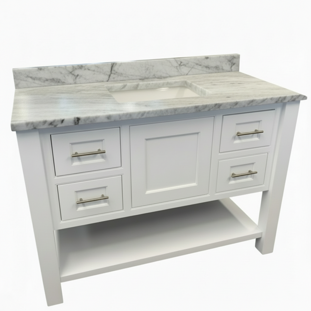 JSI 48" White Shaker Vanity w/ Fantasy Brown Stone Top & Undermount Sink – Floor Model