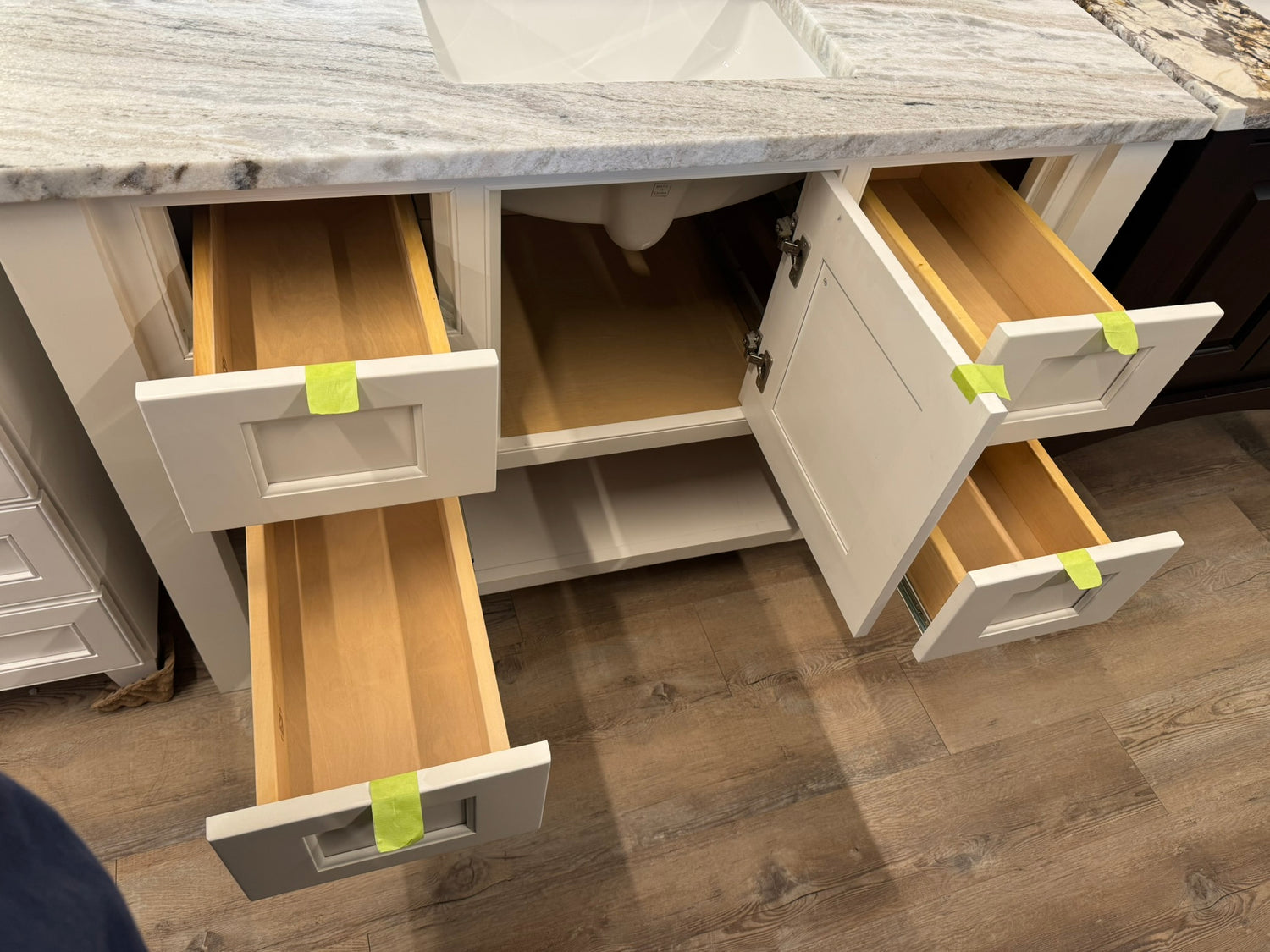 This sophisticated 48" JSI vanity represents an exceptional opportunity to acquire designer-quality bathroom cabinetry at a remarkable price point. Originally displayed in our showroom, this floor model combines JSI's signature craftsmanship with refined aesthetics. The painted white cabinet showcases solid hardwood construction and precision dovetail joinery, while soft-close mechanisms ensure whisper-quiet operation. The striking Fantasy Brown stone countertop—featuring elegant grey and tan veining—pairs beautifully with the integrated undermount porcelain sink for a seamless, high-end appearance. Measuring 49" W x 22.5" D x 34.5" H, this fully assembled vanity arrives ready for immediate installation, delivering both timeless elegance and enduring value to your home.