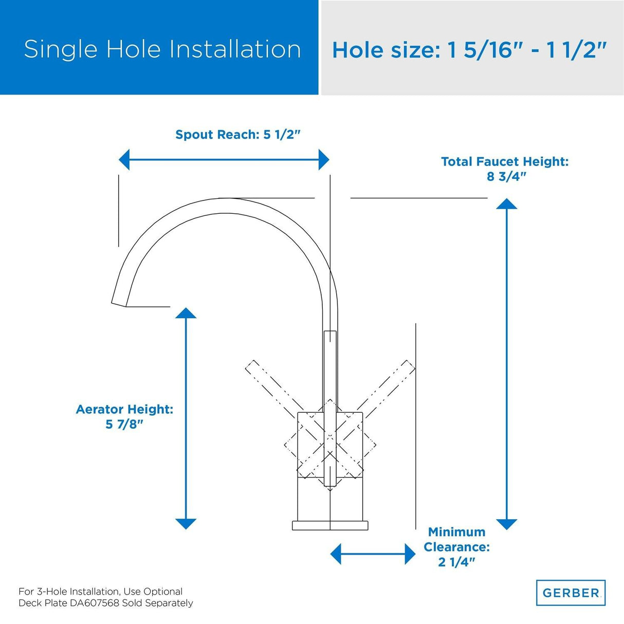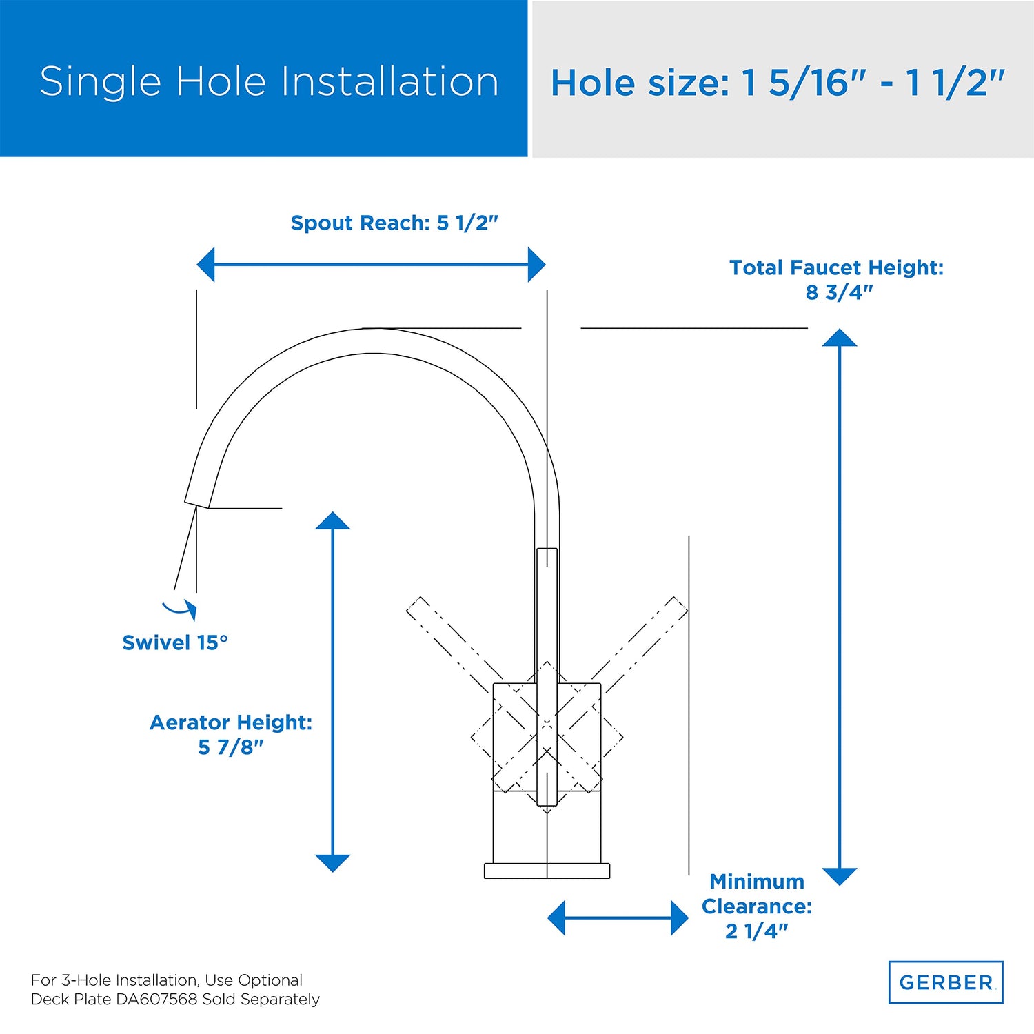 Product DescriptionDanze, INC is a manufacturer of premium showerheads, faucets, bath accessories and vitreous china fixtures. Danze faucets were first available in 2001. The product line has rapidly developed to include over 1,500 decorative products including 15 collections of faucets for the bath, over 100 faucets for the kitchen and entertainment areas, 10 collections of matching bath accessories and an impressive line of spectacular brass shower products featuring over 130 styles of showerheads and unusual shower arms. Each product is backed with a limited "lifetime" warranty against defect; the Company provides immediate access through toll free telephone to assist customers with technical, installation or other questions seven days a week. Danze products offer as standard such quality features as ceramic valves, heavy pattern brass construction, lead free waterways meeting the requirements of the ansi/nsf 61 and a wide variety of durable and decorative finishes.From the ManufacturerFor nearly 20 years, the kitchen and bath industry has known Danze as a leader in product design and beautiful styling. What industry professionals and homeowners may not have known is that Danze has a sister company, Gerber - an 85-year-old manufacturer of some of the highest performing, most reliable products on the market. To best meet the diverse and ever-changing needs of home products, Danze has transformed to be Danze by Gerber, a perfect blend of the handcrafted, trusted performance of Gerber on the inside and beautiful design on the outside. The Danze by Gerber product combination can be found in a range of kitchen and bath faucets, bath accessories and shower systems. A thoughtful balance of form and function. Inspired, beautiful design on the outside. Handcrafted, trusted performance on the inside. A combination that results in true value and commitment. You can call it a breath of fresh air. We call it Danze by Gerber. Product Information Product Overview Connection Type: 9/16 -24unef 3/8 Compression ConnectionFlow Rate: 1.2gpm Max Flow Rate @ 60 psiInstallation: 1-Hole InstallationSpray/Stream Function: Features a Natural Ribbon Water StreamBrand: Gerber Features Cartridge Type: Includes Durable Ceramic Disc Valve for Drip-Free PerformanceSpout Swivel: 360-Degree Swivel SpoutWarranty: Limited lifetime Description If you love sculptural lines and contemporary style the Sirius Single Handle Lavatory faucet is the right choice for you. From its sleek design to its stylish natural water stream this faucet is a work of art and complements any modern bathroom. The ceramic disc valve adds function to form with drip-free and easy turning performance. A touch down drain makes installation a snap. Sculpted and modern the Sirius Single Handle Lavatory Faucet uses non-aerated natural water flow and a touch down drain for easy assembly. Components Drain Type: Includes Metal Touch-Down Drain Assembly for Easy InstallationIncludes: Hot & Cold Temperature Indicator InsertDeck Plate Sold Separately: Da607568 Optional Deck Plate Sold Separately