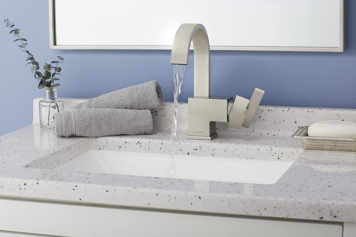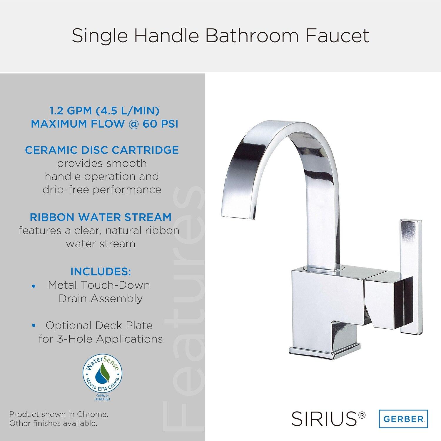 Product DescriptionDanze, INC is a manufacturer of premium showerheads, faucets, bath accessories and vitreous china fixtures. Danze faucets were first available in 2001. The product line has rapidly developed to include over 1,500 decorative products including 15 collections of faucets for the bath, over 100 faucets for the kitchen and entertainment areas, 10 collections of matching bath accessories and an impressive line of spectacular brass shower products featuring over 130 styles of showerheads and unusual shower arms. Each product is backed with a limited "lifetime" warranty against defect; the Company provides immediate access through toll free telephone to assist customers with technical, installation or other questions seven days a week. Danze products offer as standard such quality features as ceramic valves, heavy pattern brass construction, lead free waterways meeting the requirements of the ansi/nsf 61 and a wide variety of durable and decorative finishes.From the ManufacturerDanze by Gerber offers timeless design with the trusted product quality and performance of the Gerber family name. Known for style and design, discover the inspiration, value and performance of Danze by Gerber. From faucets to shower systems, toilets to bath accessories, you can depend on both striking design and uncompromising quality. Product Information Product Overview Connection Type: 9/16 -24unef 3/8 Compression ConnectionFlow Rate: 1.2gpm Max Flow Rate @ 60 psiInstallation: 1-Hole InstallationSpray/Stream Function: Features a Natural Ribbon Water StreamBrand: Gerber Features Cartridge Type: Includes Durable Ceramic Disc Valve for Drip-Free PerformanceSpout Swivel: 360-Degree Swivel SpoutWarranty: Limited lifetime Description If you love sculptural lines and contemporary style the Sirius Single Handle Lavatory faucet is the right choice for you. From its sleek design to its stylish natural water stream this faucet is a work of art and complements any modern bathroom. The ceramic disc valve adds function to form with drip-free and easy turning performance. A touch down drain makes installation a snap. Sculpted and modern the Sirius Single Handle Lavatory Faucet uses non-aerated natural water flow and a touch down drain for easy assembly. Components Drain Type: Includes Metal Touch-Down Drain Assembly for Easy InstallationIncludes: Hot & Cold Temperature Indicator InsertDeck Plate Sold Separately: Da607568 Optional Deck Plate Sold Separately