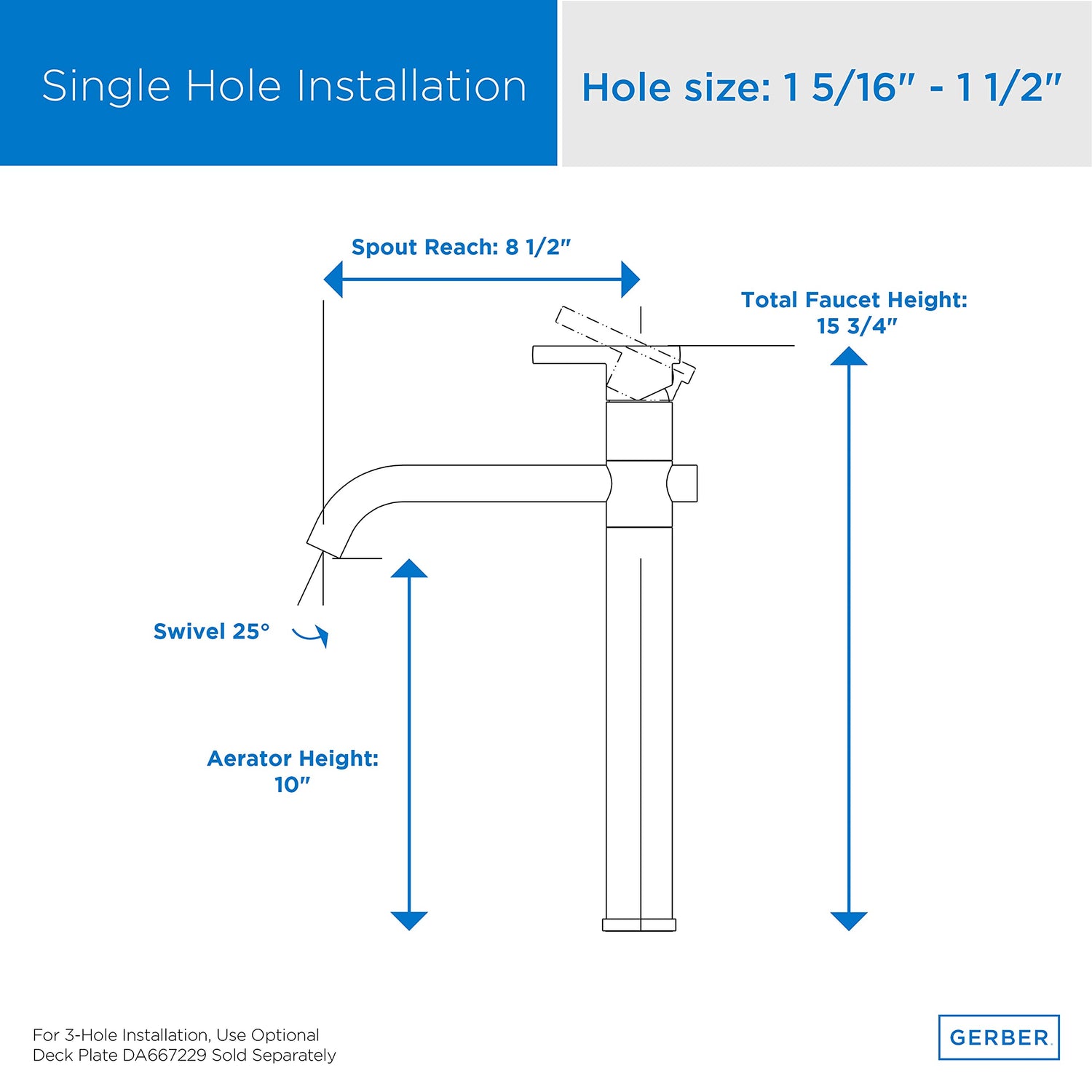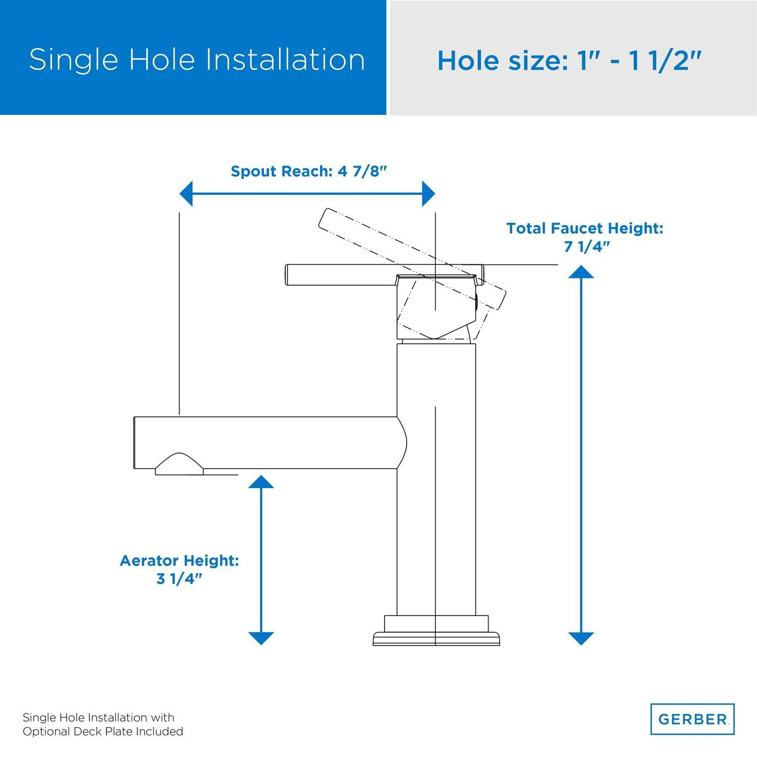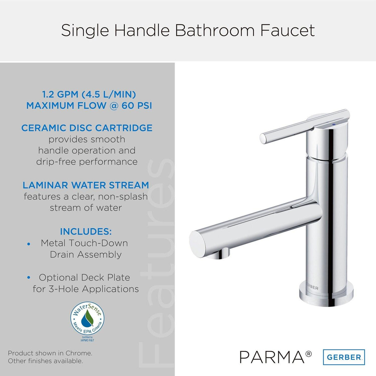 DescriptionProduct DescriptionGerber Plumbing has been manufacturing premium plumbing accessories from shower heads to faucets to china fixtures since 2001. Not only providing necessities, the products include a variety of decorative faucets and bath accessories. Designed with comfort, durability and style in mind, there is no question that this should be your choice when it comes to modern plumbing.From the ManufacturerFor nearly 20 years, the kitchen and bath industry has known Danze as a leader in product design and beautiful styling. What industry professionals and homeowners may not have known is that Danze has a sister company, Gerber - an 85-year-old manufacturer of some of the highest performing, most reliable products on the market. To best meet the diverse and ever-changing needs of home products, Danze has transformed to be Danze by Gerber, a perfect blend of the handcrafted, trusted performance of Gerber on the inside and beautiful design on the outside. The Danze by Gerber product combination can be found in a range of kitchen and bath faucets, bath accessories and shower systems. A thoughtful balance of form and function. Inspired, beautiful design on the outside. Handcrafted, trusted performance on the inside. A combination that results in true value and commitment. You can call it a breath of fresh air. We call it Danze by Gerber. Product Information Product Overview Connection Type: 9/16 -24unef 3/8 Compression ConnectionFlow Rate: 1.2gpm Max Flow Rate @ 60 psiInstallation: 1- or 3-Hole InstallationSpray/Stream Function: Features a Clear Non-Splash Laminar Water StreamBrand: Gerber Features Cartridge Type: Includes Durable Ceramic Disc Valve for Drip-Free PerformanceWarranty: Limited lifetime Description If you yearn for a bold and exciting bathroom look the Parma Single Handle Trim Line Lavatory Faucet is the style for you. This faucet promises a clean cylindrical design that s perfect for serious soaping or leisurely lathering. The ceramic disc valve construction provides a smooth turning action and drip free performance while a laminar flow aerator allows for a clear unbroken stream. Durable construction a touch down drain assembly for easy installation and a limited lifetime warranty all make the Parma Single Handle Trim Line Lavatory Faucet a spicy selection for your next project. Components Deck Plate Included: Optional Deck Plate IncludedDrain Type: Includes Metal Touch-Down Drain Assembly for Easy Installation
