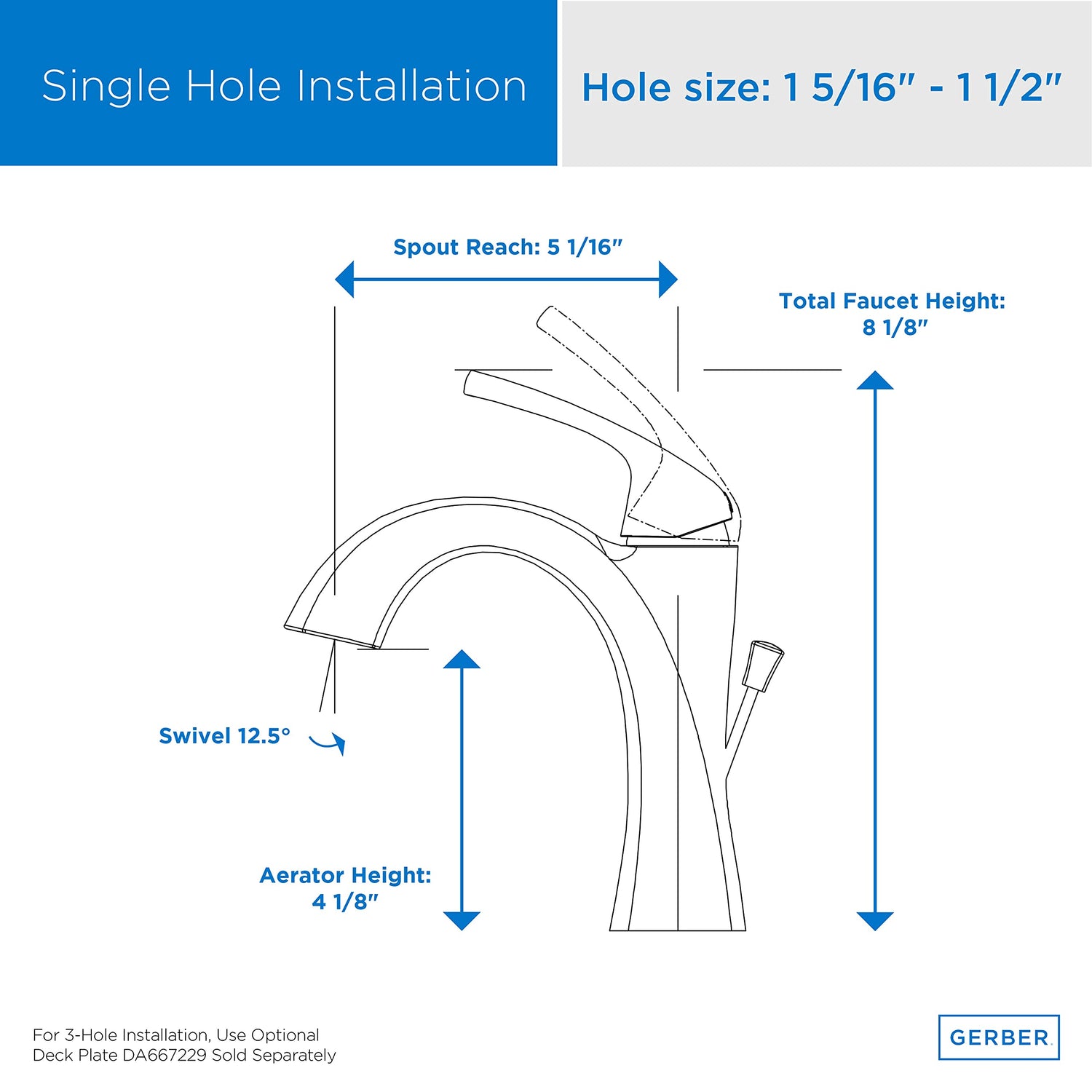 Product DescriptionCarefully curated with a streamlined aesthetic, the new Vaughn™ bath collection features a dynamic and sophisticated design. The arched curves and smooth planes of the faucet body contrast the angled faucet handle, giving the faucet an effortless beauty. Inspired by fluidity and movement, its transitional styling integrates seamlessly with any bathroom. The tub and shower trim kits are fully compatible with the powerful Gerber® Treysta valve, the latest innovation in valve technology.From the ManufacturerFor nearly 20 years, the kitchen and bath industry has known Danze as a leader in product design and beautiful styling. What industry professionals and homeowners may not have known is that Danze has a sister company, Gerber - an 85-year-old manufacturer of some of the highest performing, most reliable products on the market. To best meet the diverse and ever-changing needs of home products, Danze has transformed to be Danze by Gerber, a perfect blend of the handcrafted, trusted performance of Gerber on the inside and beautiful design on the outside. The Danze by Gerber product combination can be found in a range of kitchen and bath faucets, bath accessories and shower systems. A thoughtful balance of form and function. Inspired, beautiful design on the outside. Handcrafted, trusted performance on the inside. A combination that results in true value and commitment. You can call it a breath of fresh air. We call it Danze by Gerber. Product Information Product Overview Connection Type: 9/16 -24unef 3/8 Compression ConnectionFlow Rate: 1.2gpm Max Flow Rate @ 60 psiInstallation: 1-Hole InstallationSpray/Stream Function: Features a Clear Non-Splash Laminar Water StreamBrand: Gerber Features Cartridge Type: Includes Durable Ceramic Disc Valve for Drip-Free PerformanceWarranty: Limited lifetime Components Drain Type: Includes Metal Pop-Up Drain Assembly for Easy InstallationIncludes: Optional Hot/Cold Temperature IndicatorDeck Plate Sold Separately: Da667229 Optional Deck Plate Sold Separately