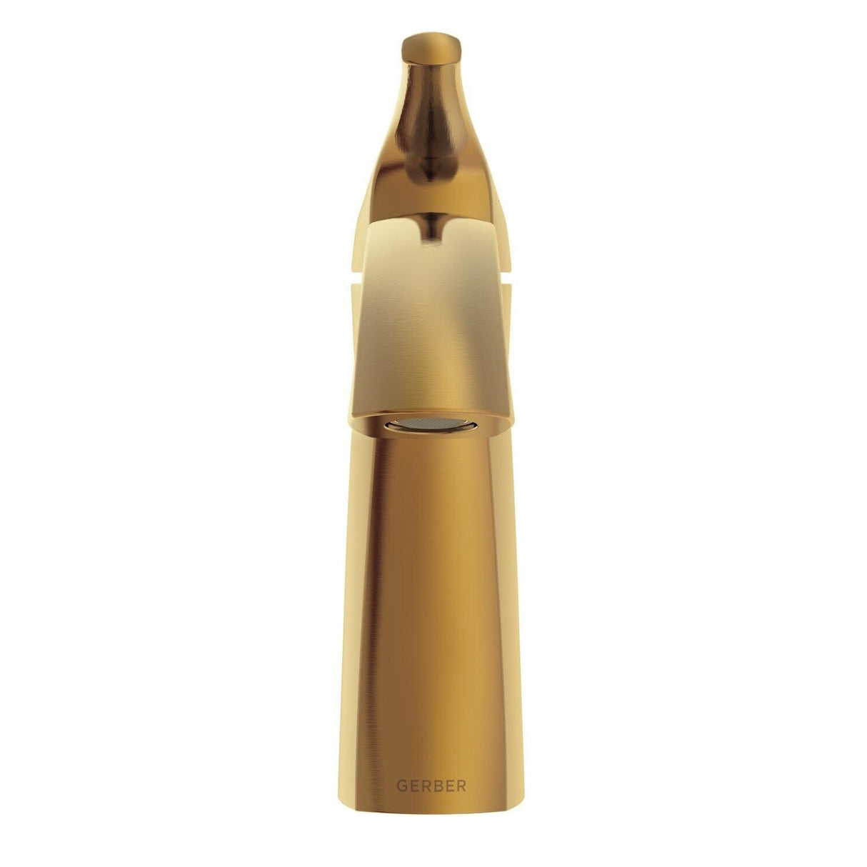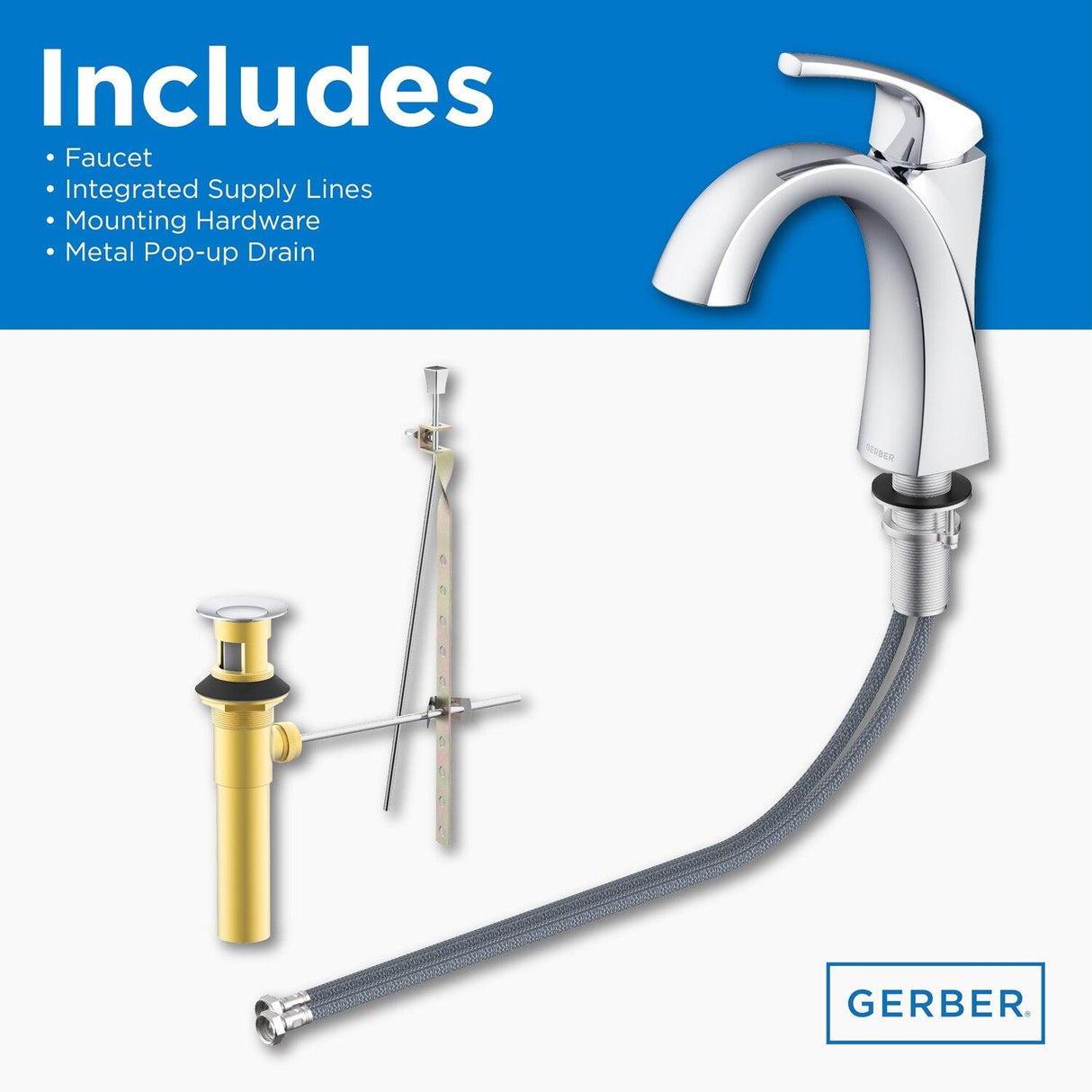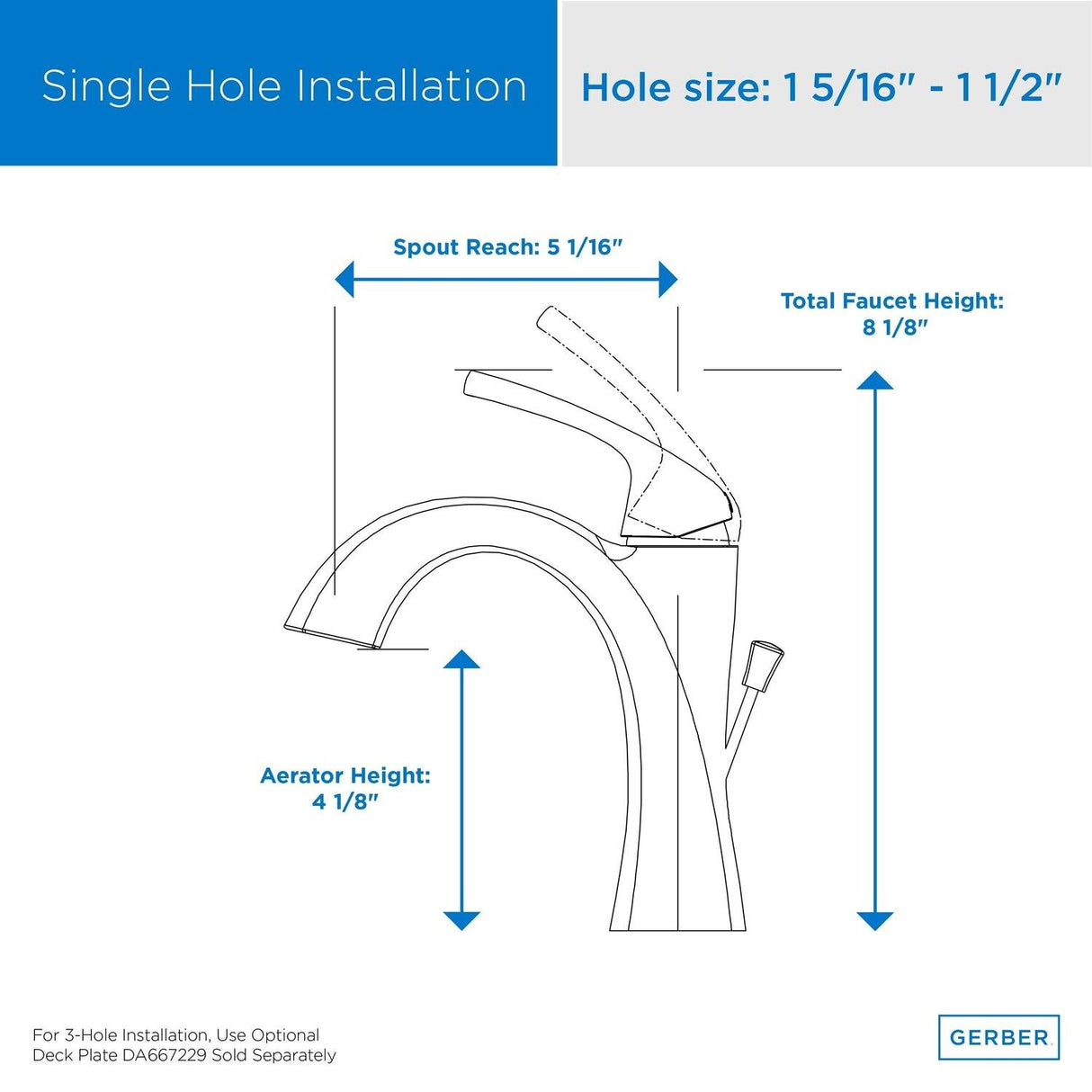 Dynamic and sophisticated, the Vaughn Single Handle Bathroom Sink Faucet combines fluid curves and smooth planes accented by an angled faucet handle. The metal faucet body and ceramic disc valve ensure lasting functionality, smooth operation, and drip-free operation. Single handle design is ADA compliant for ease of use. Delivering a water-saving 1.2 gpm flow rate that reduces utility bills, the laminar flow aerator provides a clear, low-splash, more hygienic stream. This faucet comes with everything needed for quick and complete installation including a metal pop-up drain, integrated supply lines, and all mounting hardware. An optional cover plate, sold separately, covers existing mounting holes for easy replacement. Optional hot and cold temperature indicators meet multifamily and hospitality specifications. Product Information Product Overview Connection Type: 9/16 -24unef 3/8 Compression ConnectionFlow Rate: 1.2gpm Max Flow Rate @ 60 psiInstallation: 1-Hole InstallationSpray/Stream Function: Features a Clear Non-Splash Laminar Water StreamBrand: Gerber Features Cartridge Type: Includes Durable Ceramic Disc Valve for Drip-Free PerformanceWarranty: Limited lifetime Components Drain Type: Includes Metal Pop-Up Drain Assembly for Easy InstallationIncludes: Optional Hot/Cold Temperature IndicatorDeck Plate Sold Separately: Da667229 Optional Deck Plate Sold Separately