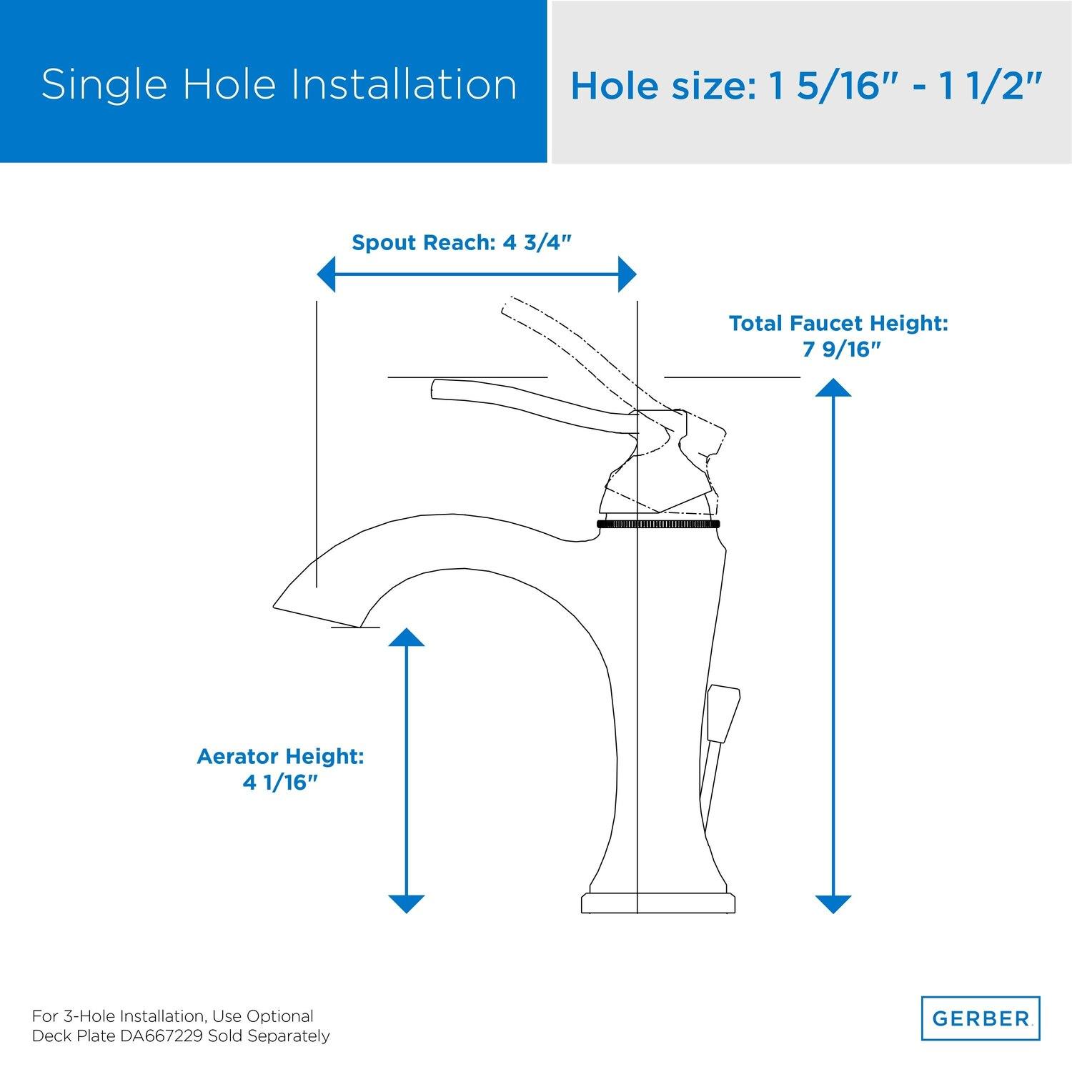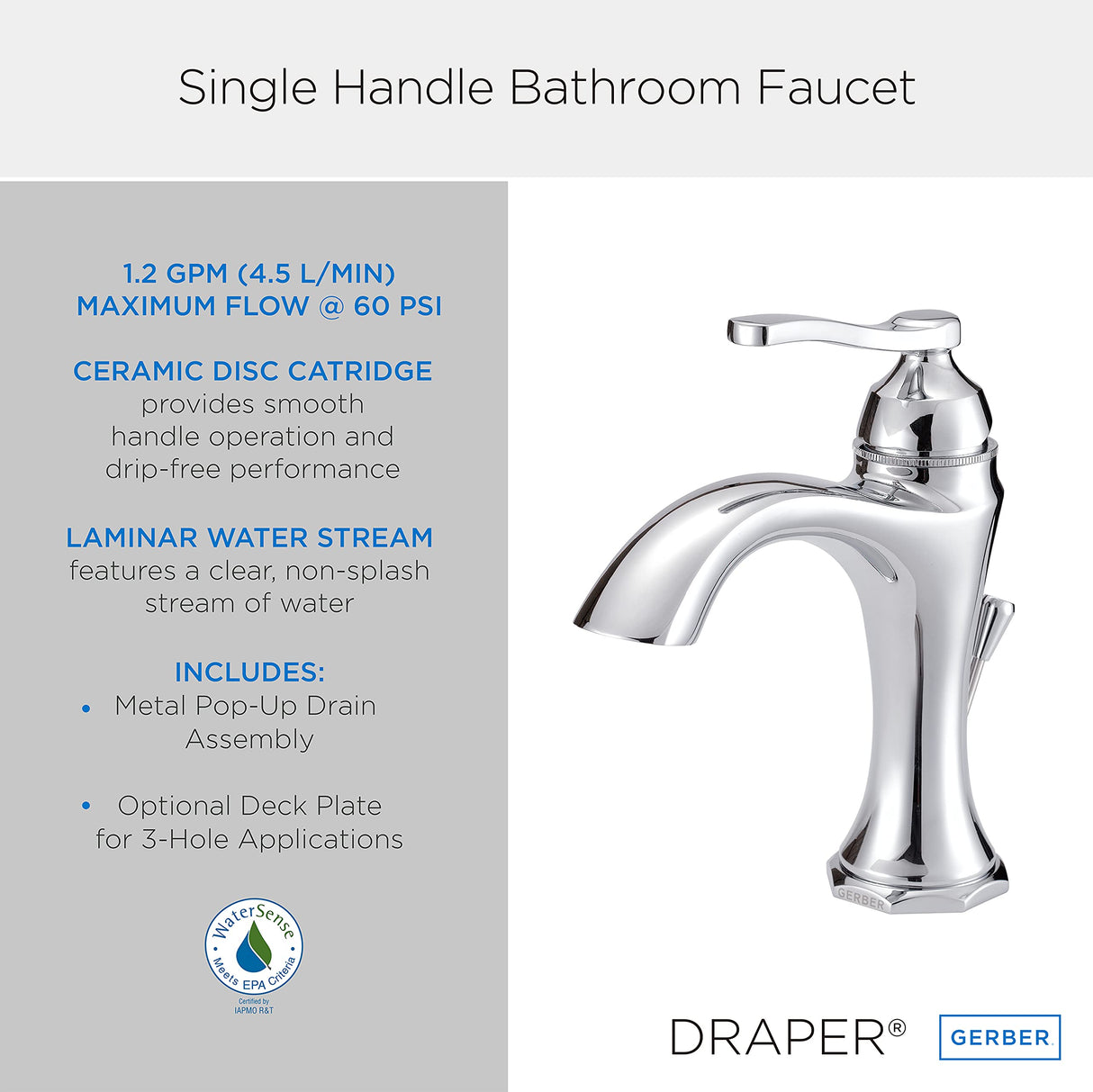 DescriptionProduct DescriptionThoughtfully crafted with an inspired aesthetic, the new Draper bath collection features vintage coin-edge details for a modern take on a classic design. The soft-industrial influence gives the faucet a refined elegance, juxtaposing the curved lines of the faucet bodies against geometric details in the faucet handles. Its traditional elegance fits effortlessly with any bathroom. The tub and shower trim kits are fully compatible with the powerful Gerber® Treysta valve, the latest innovation in valve technology.From the ManufacturerFor nearly 20 years, the kitchen and bath industry has known Danze as a leader in product design and beautiful styling. What industry professionals and homeowners may not have known is that Danze has a sister company, Gerber - an 85-year-old manufacturer of some of the highest performing, most reliable products on the market. To best meet the diverse and ever-changing needs of home products, Danze has transformed to be Danze by Gerber, a perfect blend of the handcrafted, trusted performance of Gerber on the inside and beautiful design on the outside. The Danze by Gerber product combination can be found in a range of kitchen and bath faucets, bath accessories and shower systems. A thoughtful balance of form and function. Inspired, beautiful design on the outside. Handcrafted, trusted performance on the inside. A combination that results in true value and commitment. You can call it a breath of fresh air. We call it Danze by Gerber. Product Information Product Overview Connection Type: 9/16 -24unef 3/8 Compression ConnectionFlow Rate: 1.2gpm Max Flow Rate @ 60 psiInstallation: 1-Hole InstallationSpray/Stream Function: Features a Clear Non-Splash Laminar Water StreamBrand: Gerber Features Cartridge Type: Includes Durable Ceramic Disc Valve for Drip-Free PerformanceWarranty: Limited lifetime Components Drain Type: Includes Metal Pop-Up Drain Assembly for Easy InstallationDeck Plate Sold Separately: Da667229 Optional Deck Plate Sold Separately