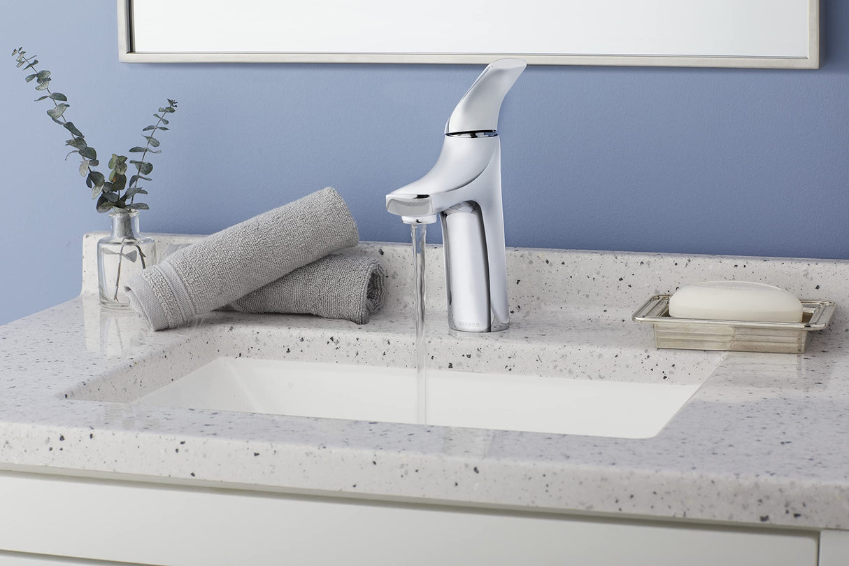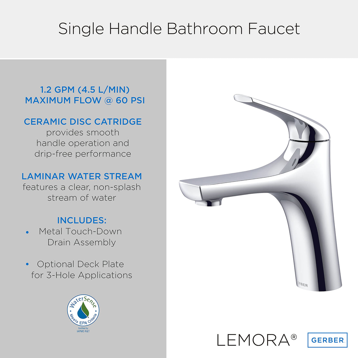 With soft curve styling highlighted by fluid edges, the Lemora Single Handle Bathroom Sink Faucet breathes new life into bathroom spaces. Offering lasting operation coupled with outstanding engineering, this bathroom sink faucet features an ADA-compliant, single handle design that incorporates a ceramic disc cartridge for smooth turning and drip-free performance. A water-saving 1.2 gpm flow rate cuts utility costs and the laminar flow aerator delivers a more hygienic water delivery. With everything you need for complete assembly, this faucet comes with an all-metal touch-down drain, integrated supply lines, and all mounting hardware. Optional temperature indicators are included to meet hospitality and multifamily installations. Product Information Product Overview Connection Type: 9/16 -24unef 3/8 Compression ConnectionFlow Rate: 1.2gpm Max Flow Rate @ 60 psiInstallation: 1-Hole InstallationSpray/Stream Function: Features a Clear Non-Splash Laminar Water StreamBrand: Gerber Features Includes Temperature Indicators on Faucet BodyCartridge Type: Includes Durable Ceramic Disc Valve for Drip-Free Performance Components Includes: Temperature Indicators on Faucet BodyDeck Plate Sold Separately: Da667229 Optional Deck Plate Sold Separately