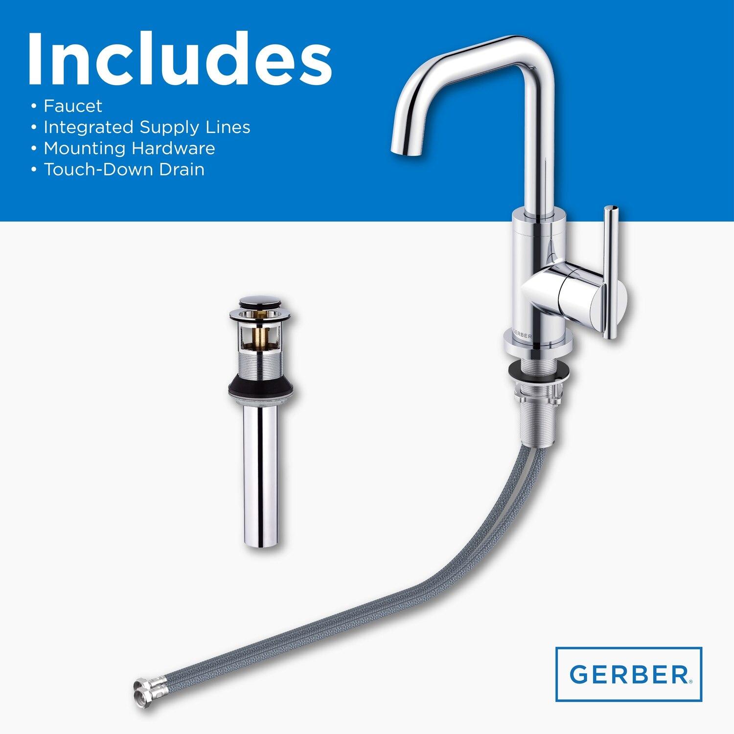 Product Information Product Overview Connection Type: 9/16 -24unef 3/8 Compression ConnectionFlow Rate: 1.2 gpm Max Flow Rate @ 60 psiInstallation: 1-Hole InstallationSpray/Stream Function: Features a Clear Non-Splash Laminar Water StreamBrand: Gerber Features 1.2 gpm Maximum Flow Rate @ 60 psiLaminar FlowCartridge Type: Includes Durable Ceramic Disc Valve for Drip-Free PerformanceWarranty: Limited lifetime Description The Parma single handle bathroom sink faucet offer cylindrical detailing enhanced by a uniquely curved spout that adds a gorgeous design element to any bathroom. All-metal faucet construction with ceramic disc valve technology ensure lasting durability combined with smooth drip-free operation. This faucet also incorporates a laminar flow aerator that delivers a clear low-splash water stream. With curves in all the right places let the Parma collection bring true beauty to your bathroom. Components Drain Type: Includes Metal Touch-Down Drain Assembly for Easy InstallationIncludes: Optional Hot/Cold Temperature IndicatorSold Separately Optional: Optional cover plate sold separatelyDeck Plate Sold Separately: Optional Cover Plate Da667229 Sold Separately