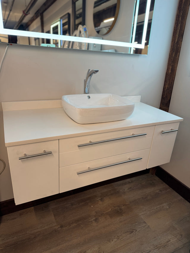 Elevate your bathroom aesthetic with our 48" Floating White Vanity Set. Crafted with a sleek quartz top, this modern vanity features a stylish ceramic vessel sink and a polished chrome vessel faucet, combining functionality with contemporary design. Its floating installation creates an open, airy feel, making it perfect for any modern bathroom remodel. Experience both elegance and practicality with this stunning vanity set.