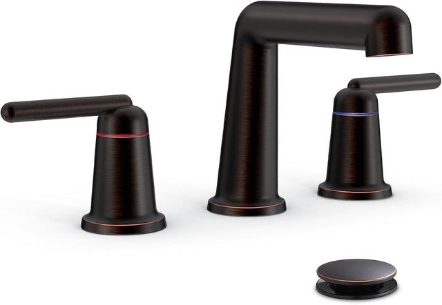 Equip your bathroom with the versatile and stylish Oil Rubbed Bronze Bathroom Faucet, designed with 3 holes for easy installation and durable performance. The included pop-up drain and flexible hoses make this faucet a convenient and reliable choice for any bathroom sink. Featuring 2 handles and an 8 inch widespread design, this faucet is suitable for a variety of settings, from vanities to RVs to baths. Enjoy the timeless beauty and functionality of this Oil Rubbed Bronze Bathroom Faucet.
