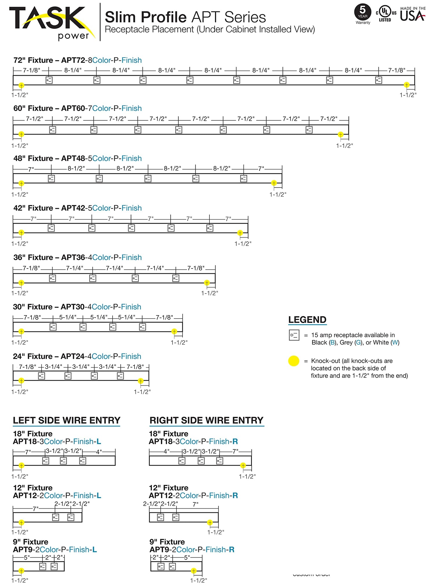 The patented APT Angle Power Strip mounts under cabinets and countertops and is an ideal alternative to standard outlets that are cut into tile, glass, wood panels, metal and other solid surfaces. The fixture is easily hidden while the angle offers easy access to receptacles. Use in the kitchen, bathroom, office, shop, craft room and home entertainment center. Custom options include length, additional receptacles, and switches for lights and garbage disposal. Features 15 amp tamper resistant receptacles. Meets 2008 NEC. Mounting hardware included. Requires installation by licensed electrician.