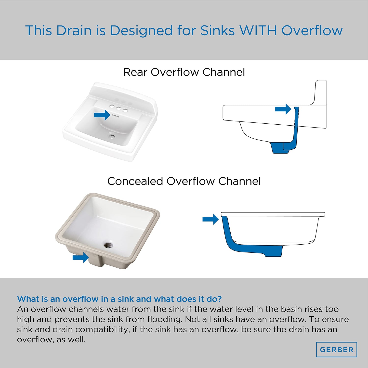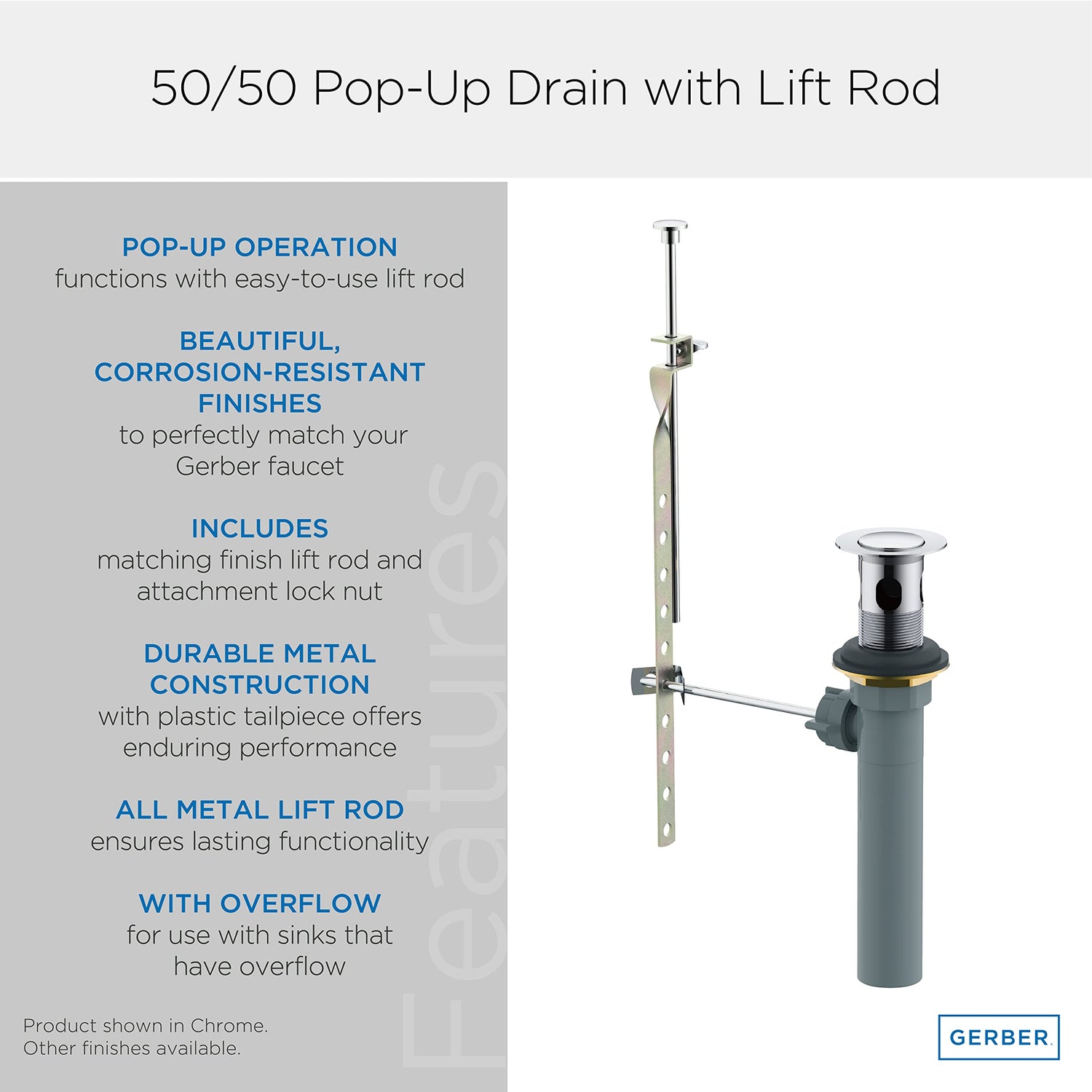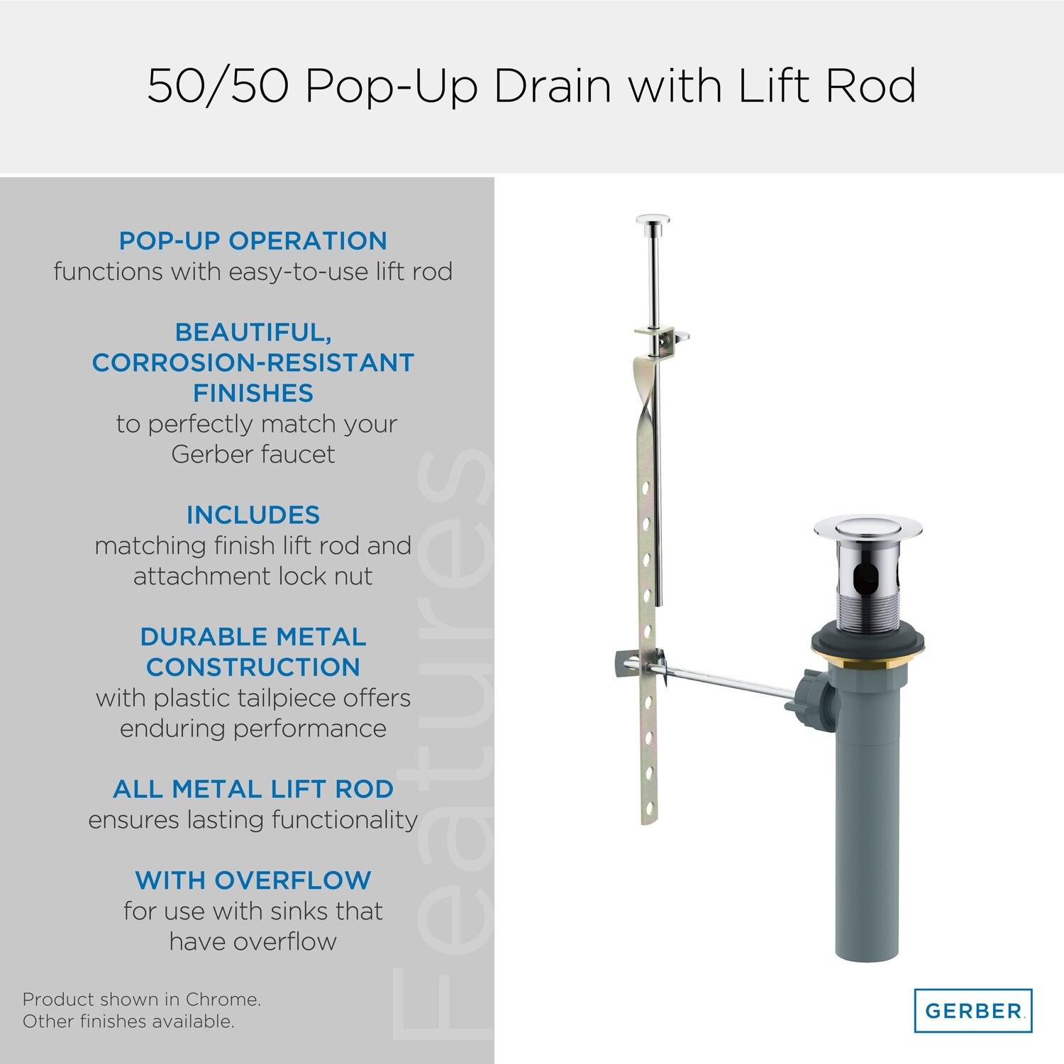 Product Information Product Overview Brand: Gerber Features For Sinks with Overflow DrainsIncludes Lift Rod assemblyPlastic tailpiece with 1 1/4 diameterWarranty: Limited lifetime Description Offered in finishes designed to match your faucet this 1 1/4 Pop-Up Drain Assembly with Lift Rod is an ideal way to coordinate your bathroom. This drain assembly helps to channel the flow of water from the sink and features a solid rubber stopper to ensure the retention of water when needed. Made for bathroom sinks with overflow drains this drain assembly s sturdy construction helps ensure it performs reliably for the life of the product.