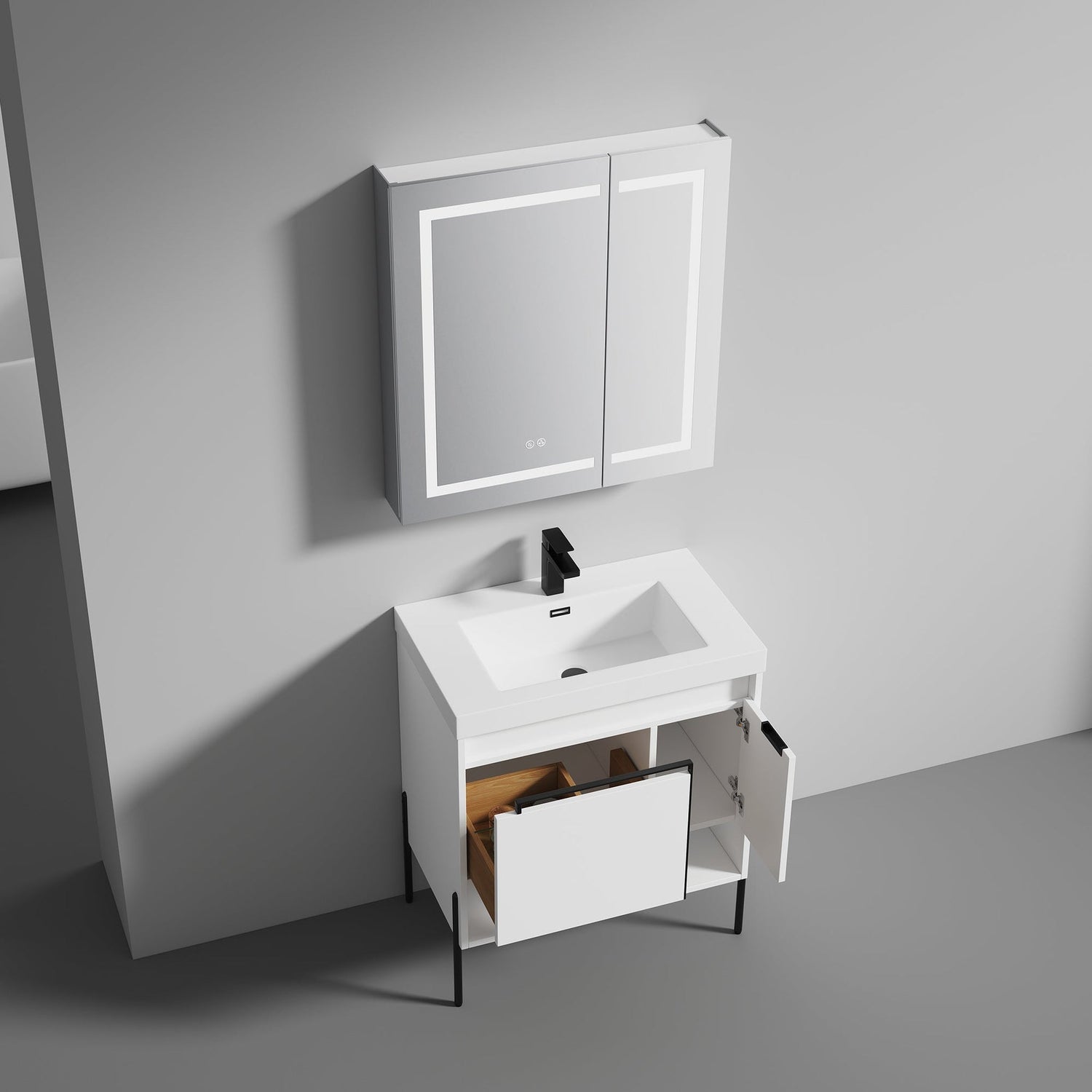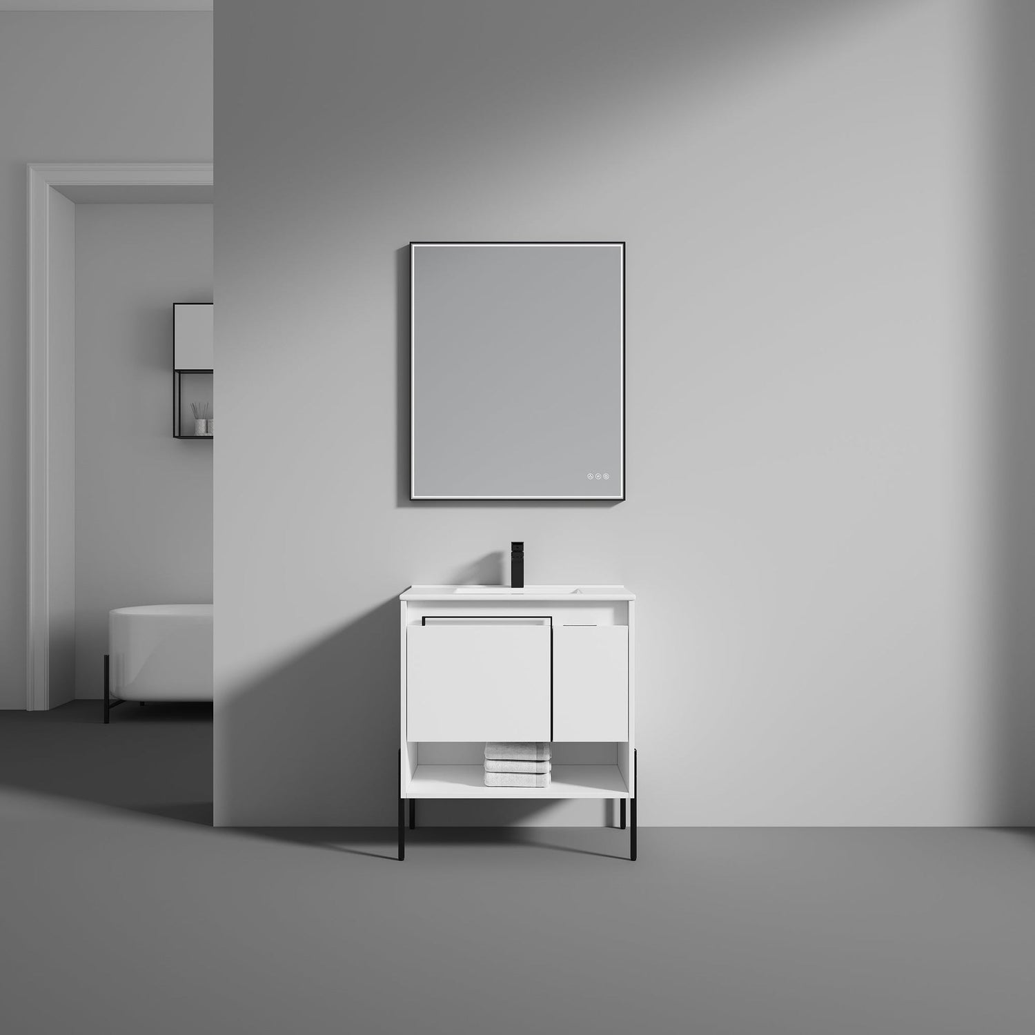 Blossom Turin 30" 1-Door 1-Drawer Matte White Freestanding Single Vanity Base With Open Shelf, Handle and Legs