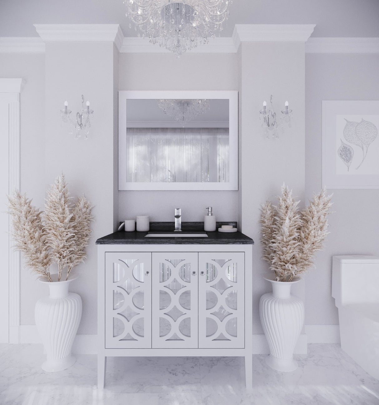 Presenting the Mediterraneo Collection, if you’re going for the “Putting on the Ritz” look, with a nod to classical vintage, this look brings its classic relevance to today’s bathrooms. The Mediterraneo vanity features a real wood cabinet with doors that showcases classical cut-outs, layered onto a mirrored glass background. As you reach for the crystal glass knobs on the cabinet's soft-closing doors, they open to an open bottom platform which contains a surprise hidden drawer with soft closing rails. Style and functionality have indeed married and produced this fantasy beauty, come to reality in two finishes: Grey and Classic White.