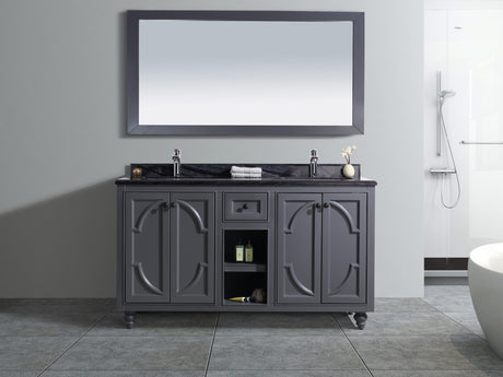 Regular price $2,84925UnavailableIn stock online (20 Units)Odyssey 60" Maple Grey Double Sink Bathroom Vanity with Black Wood Marbl...
