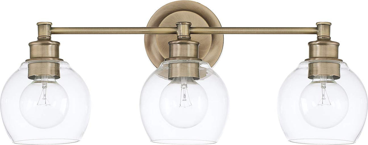 Our Mid-Century 3-light vanity fixture embraces the revival of warm and earthy finishes as a trend to create a cozy relaxing space. With a soft sheen that s not as ornate as gold but just as impressive the Aged Brass finish gives off subtle visual texture. Paired with clear rounded glass that mimics wine glasses this vanity light washes the bathroom or powder room in elegant illumination. This fixture is also available in a Polished Nickel finish.