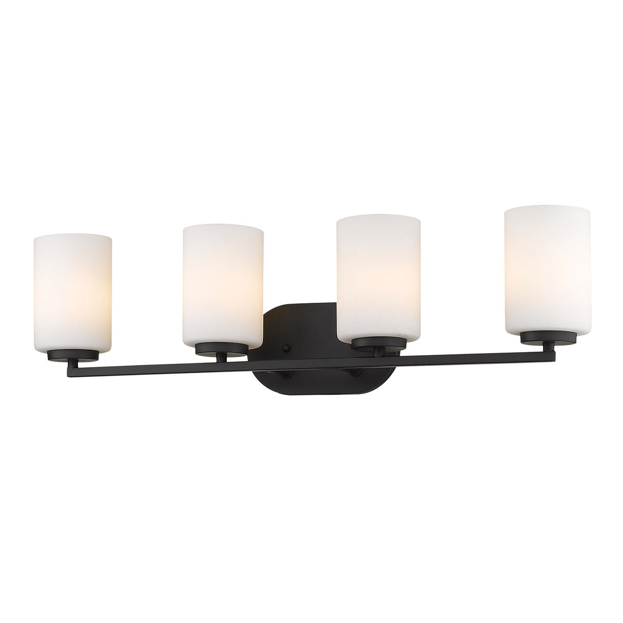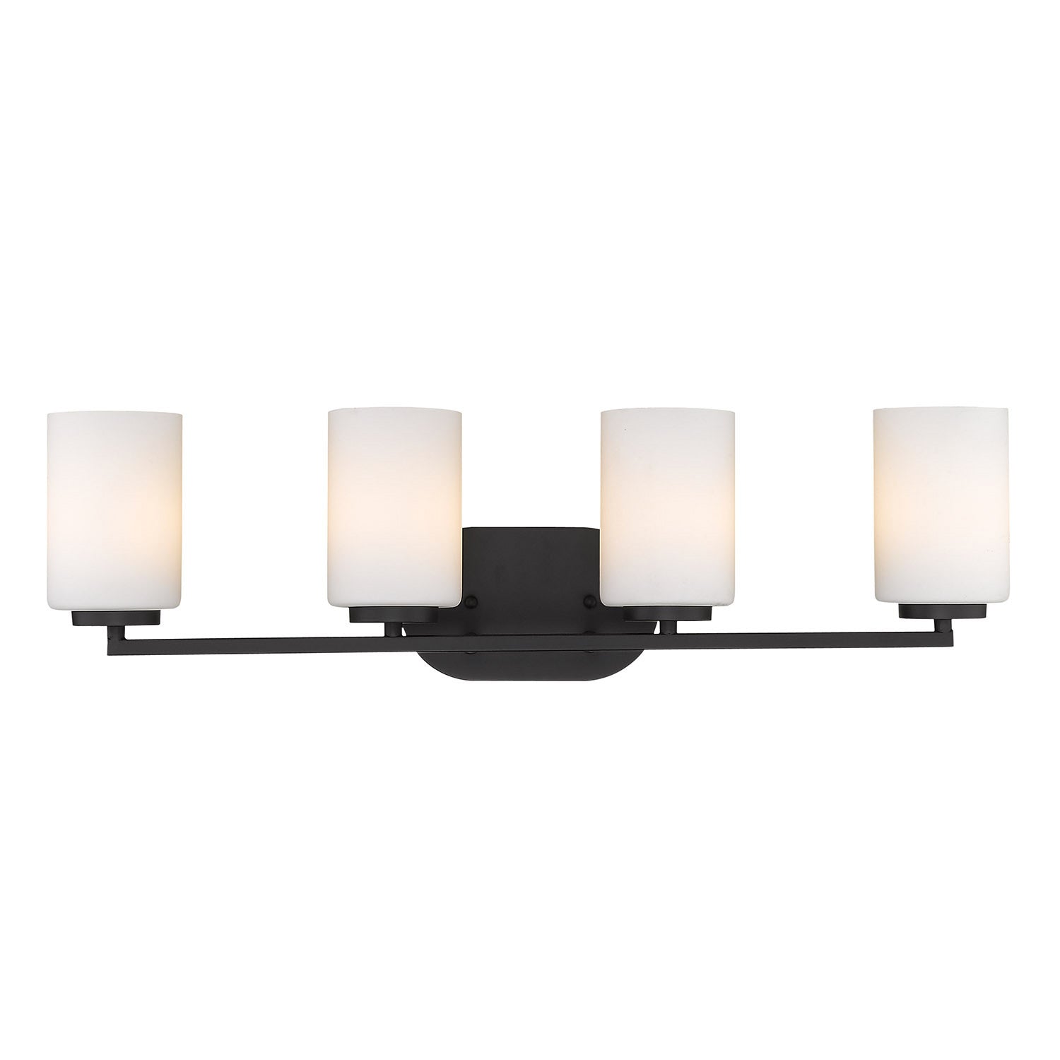 This simple and versatile look is at home in transitional to modern settings. The smooth, matte black finish adds a contemporary feel. The neutral white shade dresses up the look, while softening the geometric lines and gently diffusing the light. This fixture may be mounted with the glass facing up or down. This 4-light bath vanity is UL approved for damp locations.