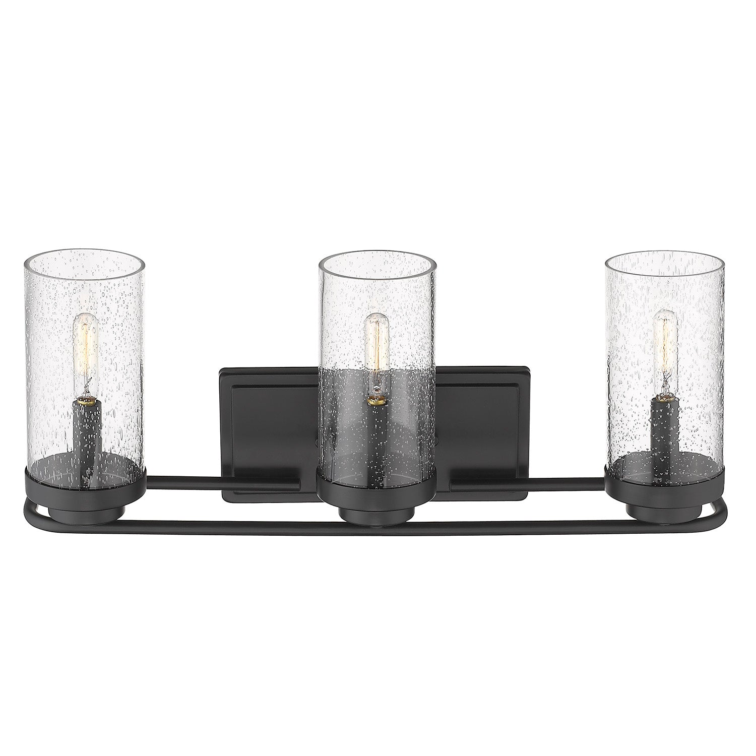 Transitional in design, Holden is a collection of sophisticated fixtures with slightly playful silhouettes. Sleek and graceful slender tubes defy gravity to hold tall cylindrical glass shades atop metal cups. With its mid-century modern aesthetic and two finish options, the series was created with a variety of interiors in mind. Choose between a stately plated aged brass finish, or a striking matte black. When illuminated, the clear seeded glass softly diffuses the light cast by the slim candelabras for a radiant look. This 3-light bath vanity is UL approved for damp locations.
