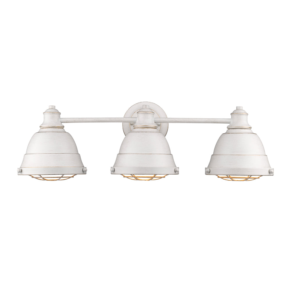 The Bartlett collection features industrial, vintage-inspired fixtures with simple, traditional silhouettes that are a nod to a bygone era. The collection features authentic details like caged diffusers and exposed hardware. Available in a selection of rustic finishes. This 3-light bath vanity is UL approved damp locations.