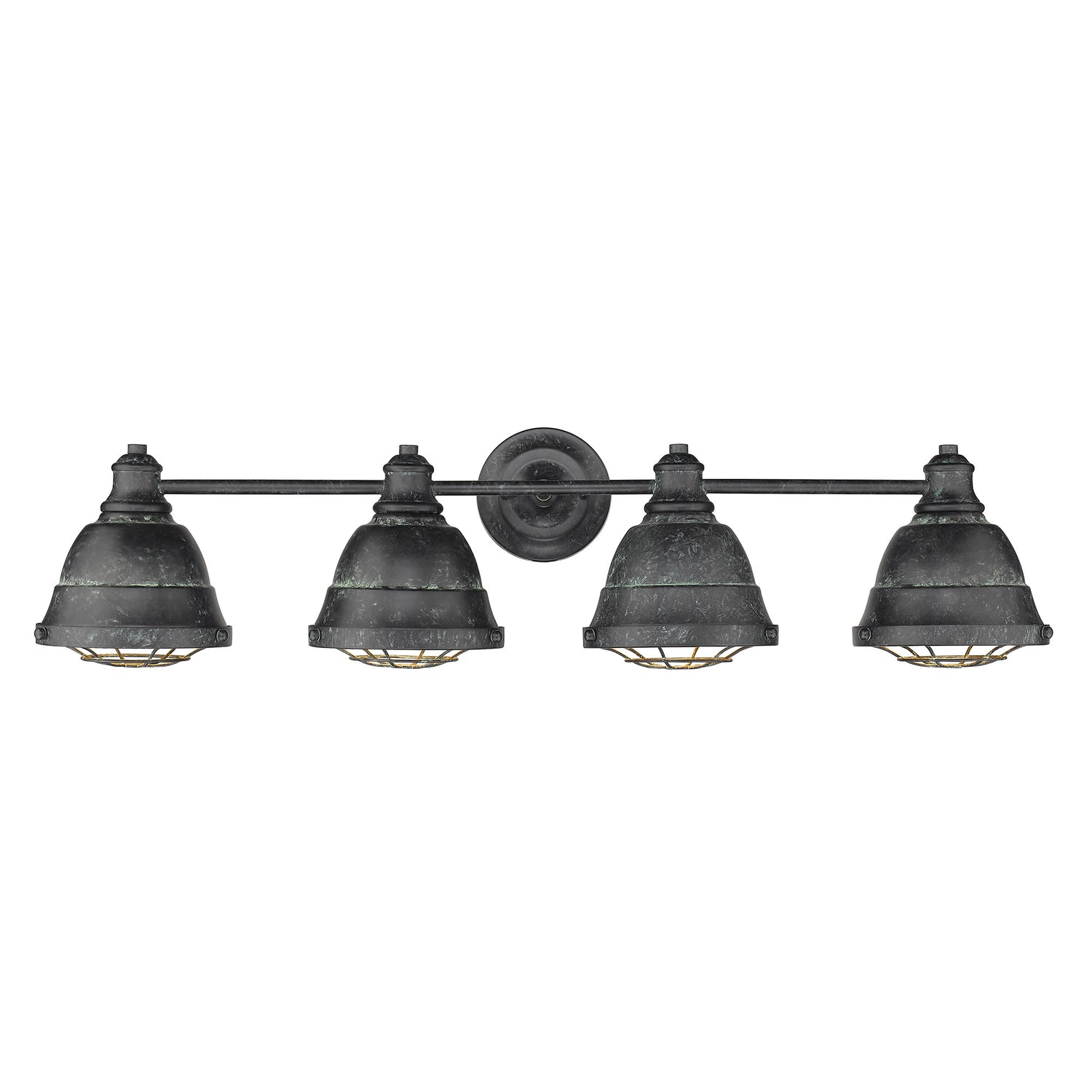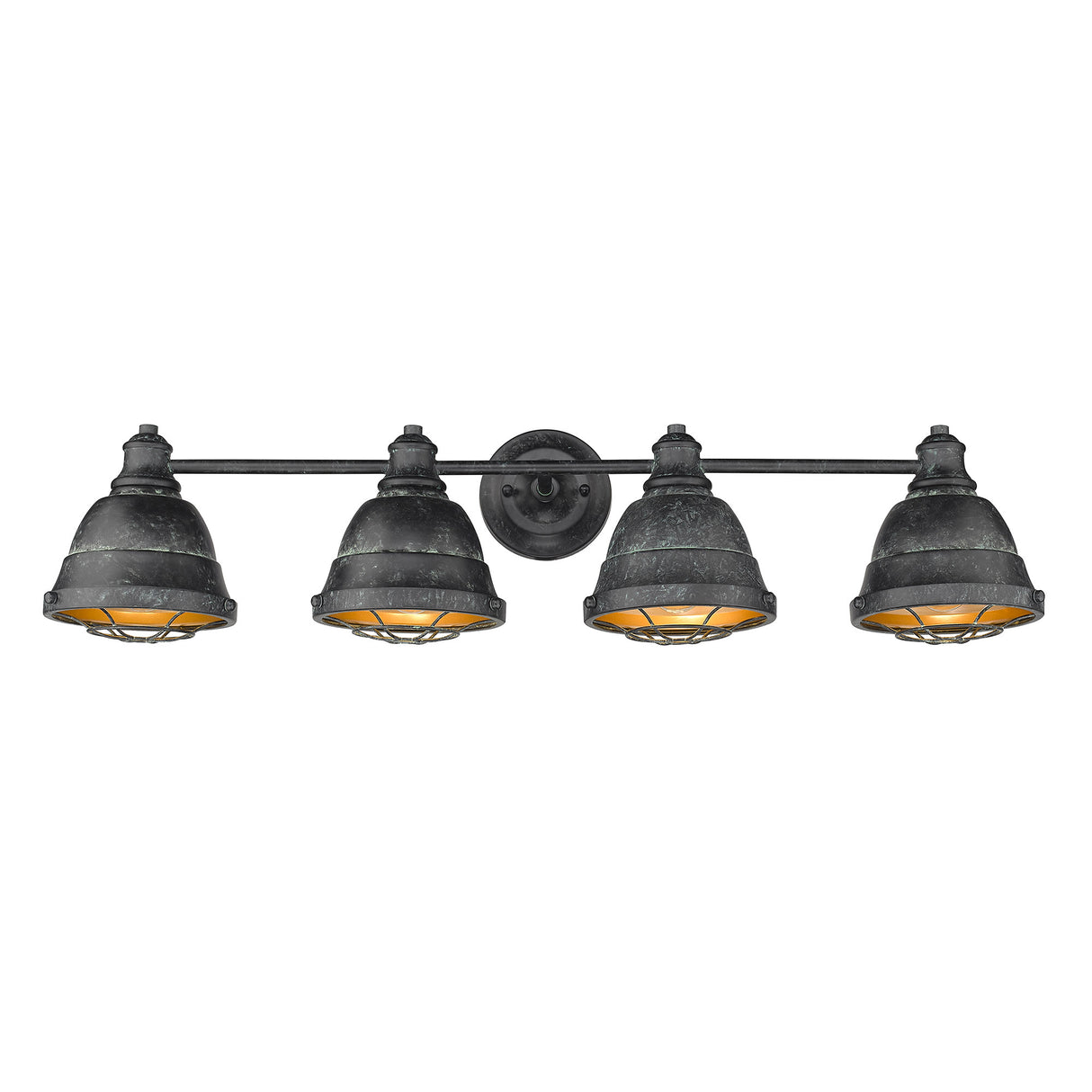 The Bartlett collection features industrial, vintage-inspired fixtures with simple, traditional silhouettes that are a nod to a bygone era. The collection features authentic details like caged diffusers and exposed hardware. Available in a selection of rustic finishes. This 4-light bath vanity is damp rated.