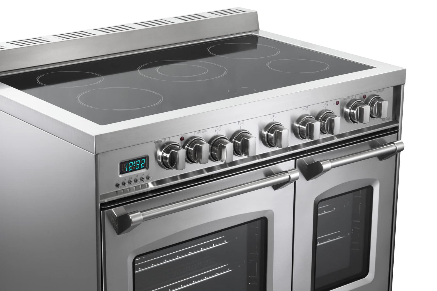 Prestige 36" Electric Glass Top Double Oven Range - Stainless Steel, MADE IN ITALY - Stainless Steel , Gorgeous, Unique All Electric Range Oven - Black Ceramic Glass Cooktop, | An Intelligently Designed 5 burner cooktop configuration Sealed Elements, left Front Burner 1700W /7 - Right Front Burner 1200W /6 - Center Dual Zone, 700W PerfectSimmer / 4.5" - 2100W InstaBoil /8 - Left Rear 1200W 6- Right Rear 1700W / 7 , Stainless Steel Round Oven Handle, Chrome knobs, Beveled Oven door, Adjustable Stainless Steel legs | This Range is durable and has high corrosion resistance. Multi Function programmable Oven, 7 Programmable Cooking Modes, True European Convection, Broiler, Full- Width Storage Drawer, 2 Heavy Duty Oven Pullout Racks , Clock Timer, Temperature Indicator Light | EZ Clean Porcelain Oven Surface, Main Oven Capacity 2.4 (Cu. Ft.) Oven Width: 18" Oven Depth: 16" Oven Height: 13 3/4 - Second Oven Capacity 1.5 (Cu. Ft.) Oven Width: 11" Oven Depth: 16" Oven Height" 13 3/4" - Dimensions Width: 35.875" Height: 35.375" Depth: 24" Exterior Width: 36" - Included Backguard 2" | 120/240 Volts Amps 50A - Residential Use Only, Power Cord Not Included - 2 Year Manufacturer Warranty