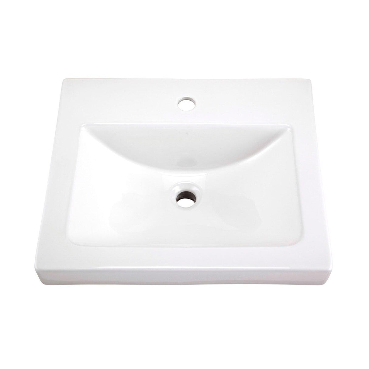 Gerber 12-892 - Bathroom sink with hole on wicker countertop Details: Dimensions: 20 3/4" x 17 3/ 4" Rectangular basin Concealed front overflow. Rear-facing drain hole location for easy drain installation Mid-profile sink offers the luxury design of a single-vessel sink but installs easily as a drop Faucet and drain sold separately. Product Information Product Overview Configuration: Single HoleDrain Location: RearOverflow Location: FrontSink Shape: RectangularBrand: Gerber Features Concealed Front OverflowFaucet and Drain not IncludedMedium Profile Lavatory that Offers the Upscale Design of a Vessel Sink but Installs Easily as a Drop-InRear-Oriented Drain Hole Location for Ease of Drain InstallationRectangular Shaped BasinUniversally Accessible; Compliant with the Americans with Disabilities Act Standards; See Spec Sheet for Installation Details