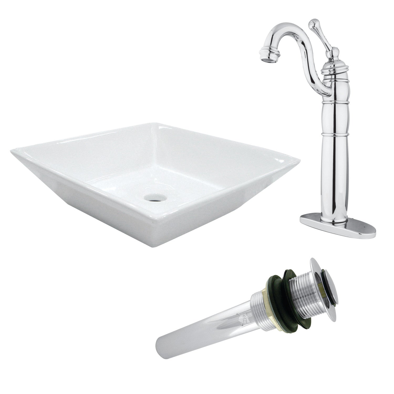 Perfection EV4256B1421 Ceramic Square Vessel Sink with Faucet and Drain, White/Polished Chrome