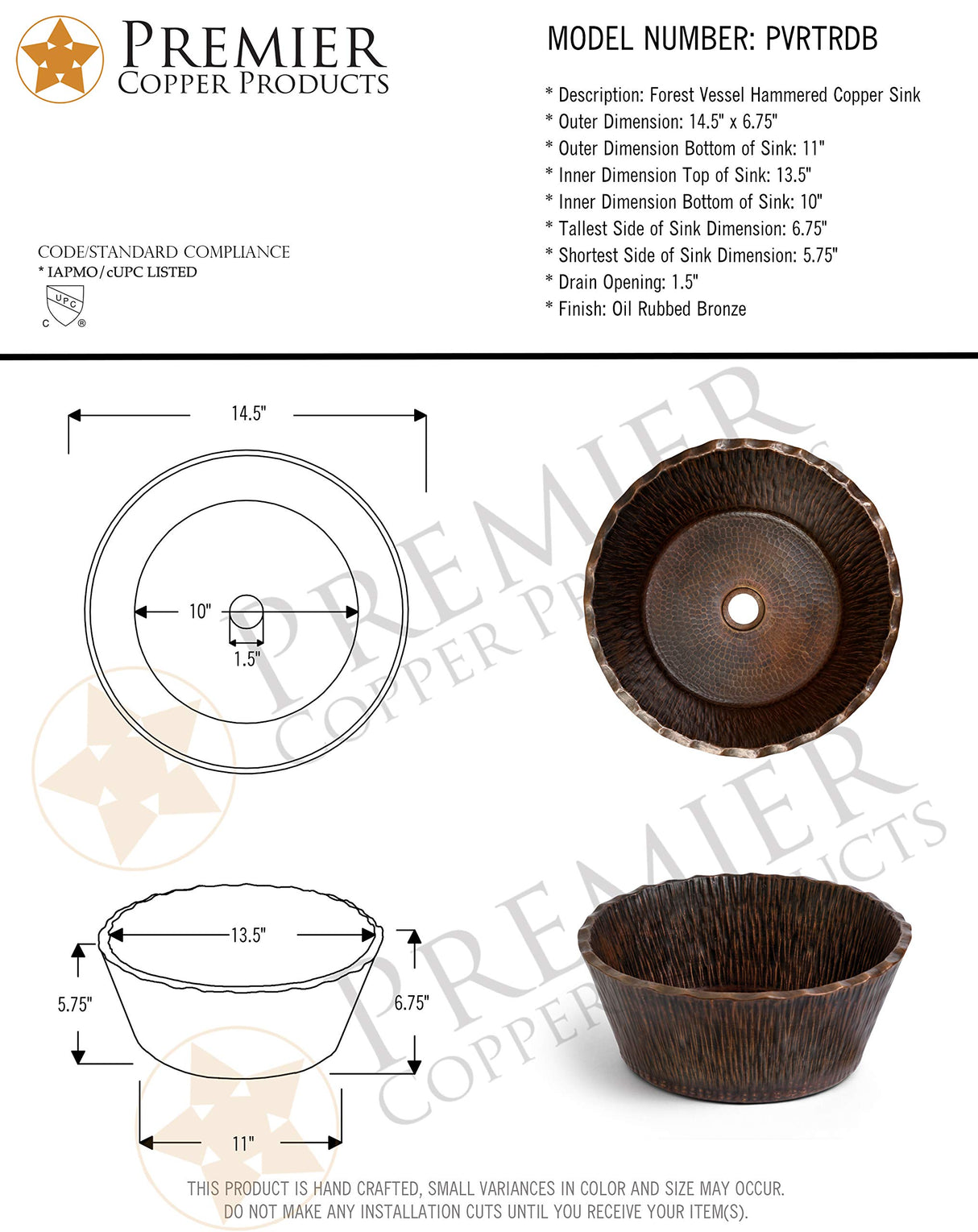 Premier Copper Products PVRTRDB 14.5-Inch Forest Vessel Hammered Copper Sink