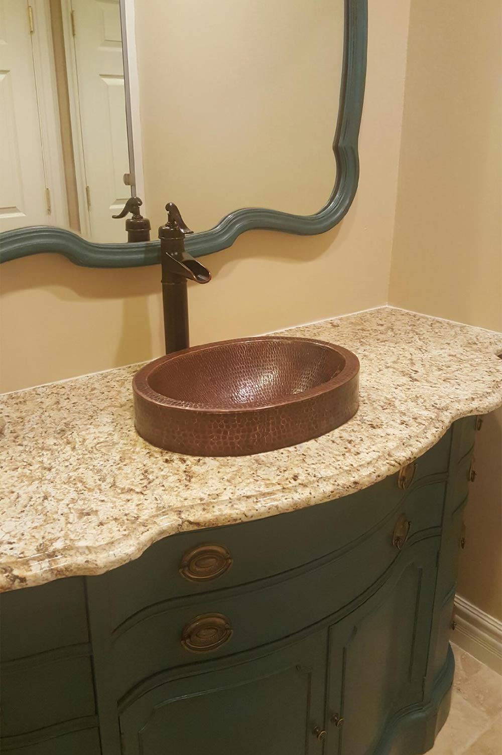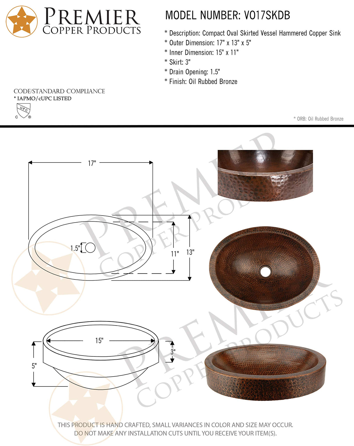 Uncompromising quality, beauty and functionality make up this Premier Oval Vessel Style Bathroom Sink with Skirted Rim. Green recyclable products like copper sinks are a must have in today's modern home. This product is sure to impress your guests and satisfaction is always guaranteed. Oval hammered copper surface with 3-Inch Skirted Copper Rim. Dimensions: inner 15-Inch by 11-Inch by 5-Inch, outer 17-Inch by 13-Inch by 3-Inch skirt. Installation Type: Vessel, Half Recessed and Half Above Counter of 3-Inch. It has 1-Inch rim and 3-Inch rim skirt height and overall height of 5-Inch. The countertop depth measures 16-Inch front to back. Material gauge: Industry Best (16-guage or .0500-Inch). Drain size is 1.5-Inch, non-overflow. Suggested Drain Models: D-207ORB, D-208ORB (Drain sold separately). The faucet mounting position is vessel counter deck mount. It is handmade, 100-Percent recyclable and made of 99.7-Percent pure recycled copper. It is Lead Free (less than 0.01-Percent). Features an oil rubbed bronze finish. Comes with a limited lifetime warranty. Suggested accessories: Installation Silicone for Model: C900-ORB, Copper Sink Wax- Model: W900-WAX, Copper Pendant Lights for Models: L100DB-L500DB.From the ManufacturerUncompromising quality, beauty and functionality make up this Premier Oval Vessel Style Bathroom Sink with Skirted Rim. Green recyclable products like copper sinks are a must have in today's modern home. This product is sure to impress your guests and satisfaction is always guaranteed. Oval hammered copper surface with 3-Inch Skirted Copper Rim. Dimensions: inner 15-Inch by 11-Inch by 5-Inch, outer 17-Inch by 13-Inch by 3-Inch skirt. Installation Type: Vessel, Half Recessed and Half Above Counter of 3-Inch. It has 1-Inch rim and 3-Inch rim skirt height and overall height of 5-Inch. The countertop depth measures 16-Inch front to back. Material gauge: Industry Best (16-guage or .0500-Inch). Drain size is 1.5-Inch, non-overflow. Suggested Drain Models: D-207ORB, D-208ORB (Drain sold separately). The faucet mounting position is vessel counter deck mount. It is handmade, 100-Percent recyclable and made of 99.7-Percent pure recycled copper. It is Lead Free (less than 0.01-Percent). Features an oil rubbed bronze finish. Comes with a limited lifetime warranty. Suggested accessories: Installation Silicone for Model: C900-ORB, Copper Sink Wax- Model: W900-WAX, Copper Pendant Lights for Models: L100DB-L500DB.