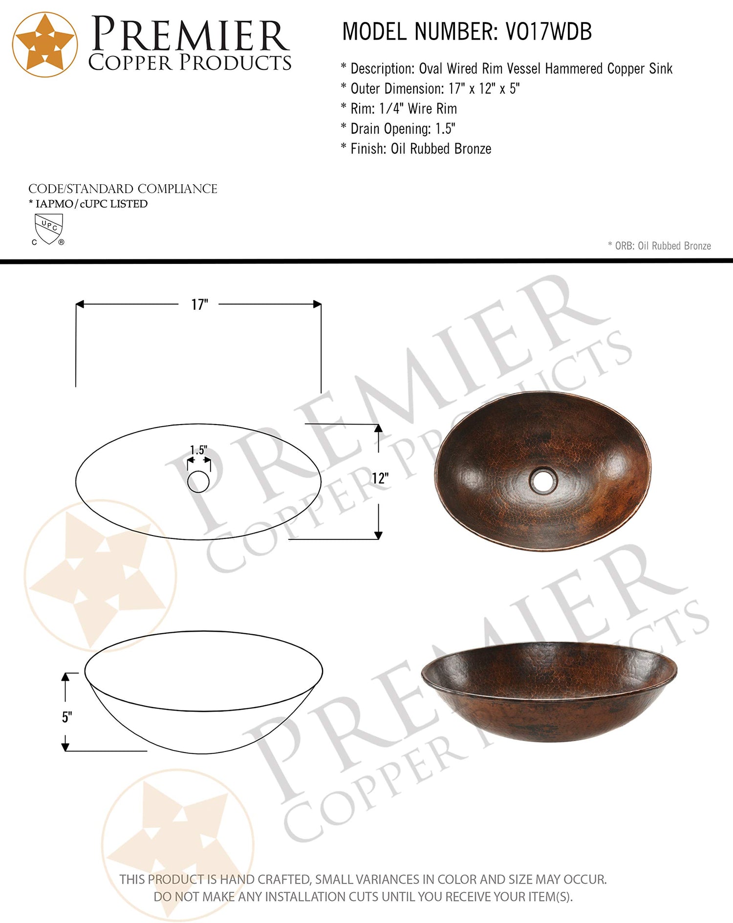 Uncompromising quality, beauty and functionality make up this Premier Oval Vessel Style Bathroom Sink with Rigid Copper Wrapped Wire Rim. Green recyclable products like copper sinks are a must have in today's modern home. This product is sure to impress your guests and satisfaction is always guaranteed. Dimensions: inner 17-Inch by 12-Inch by 5-Inch, outer 17-Inch by 12-Inch by 5-Inch. Installation Type: vessel, above counter. Rim: Rigid Copper Wrapped Wire. The countertop depth measures 15-Inch front to back. Material gauge: Industry Best (17-guage or .0450-Inch). Drain size is 1.5-Inch, non-overflow. Suggested Drain Models: D-207ORB, D-208ORB (Drain sold separately). The faucet mounting position is vessel counter deck mount. It is handmade, 100-Percent recyclable and made of 99.7-Percent pure recycled copper. It is Lead Free (less than 0.01-Percent). Features an oil rubbed bronze finish. Comes with a limited lifetime warranty. Suggested accessories: Installation Silicone for Model: C900-ORB, Copper Sink Wax- Model: W900-WAX, Hammered Copper Waste Bin for Model: TC11DB.From the ManufacturerUncompromising quality, beauty and functionality make up this Premier Oval Vessel Style Bathroom Sink with Rigid Copper Wrapped Wire Rim. Green recyclable products like copper sinks are a must have in today's modern home. This product is sure to impress your guests and satisfaction is always guaranteed. Dimensions: inner 17-Inch by 12-Inch by 5-Inch, outer 17-Inch by 12-Inch by 5-Inch. Installation Type: vessel, above counter. Rim: Rigid Copper Wrapped Wire. The countertop depth measures 15-Inch front to back. Material gauge: Industry Best (17-guage or .0450-Inch). Drain size is 1.5-Inch, non-overflow. Suggested Drain Models: D-207ORB, D-208ORB (Drain sold separately). The faucet mounting position is vessel counter deck mount. It is handmade, 100-Percent recyclable and made of 99.7-Percent pure recycled copper. It is Lead Free (less than 0.01-Percent). Features an oil rubbed bronze finish. Comes with a limited lifetime warranty. Suggested accessories: Installation Silicone for Model: C900-ORB, Copper Sink Wax- Model: W900-WAX, Hammered Copper Waste Bin for Model: TC11DB.