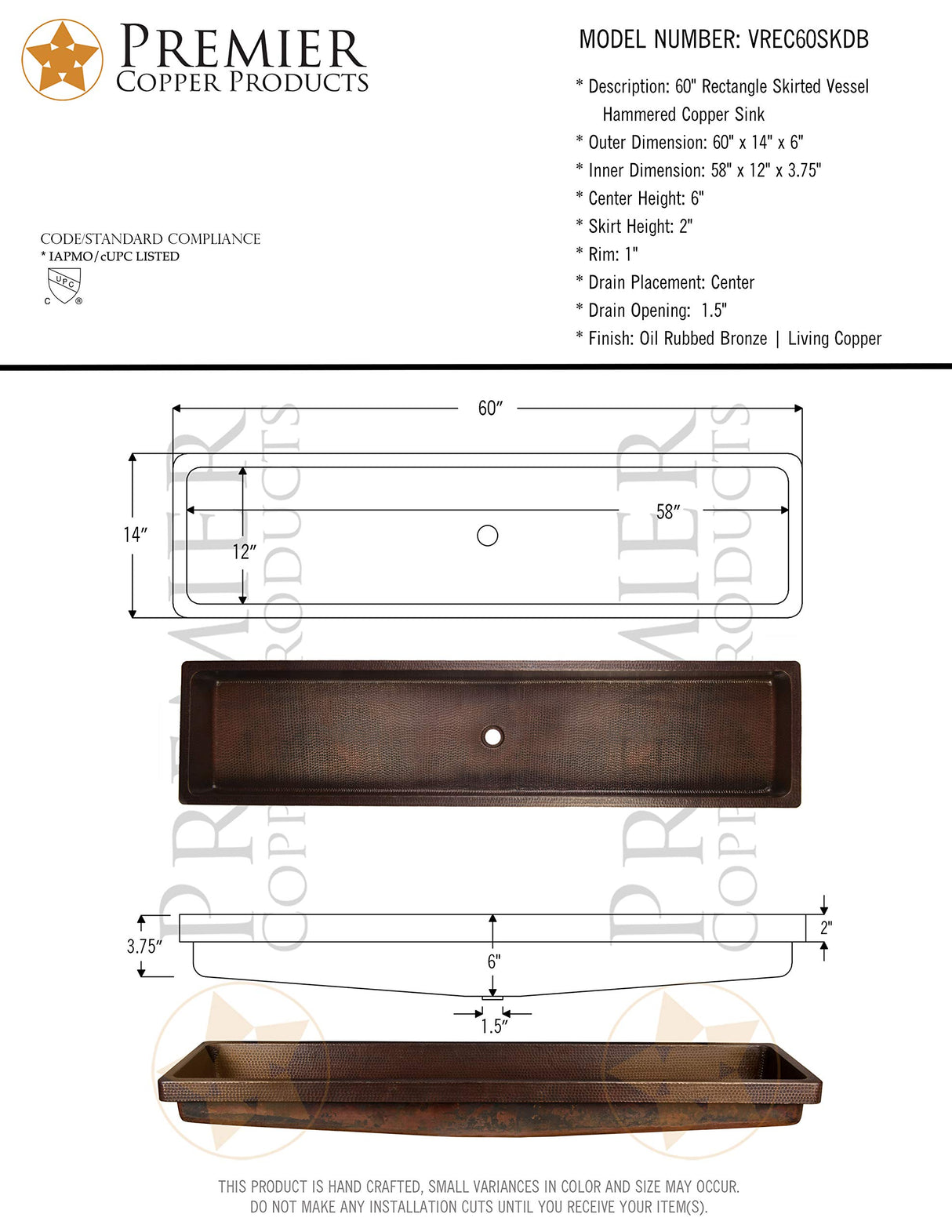 Premier Copper Products VREC60SKDB 60-Inch Rectangle Skirted Vessel Hammered Copper Sink